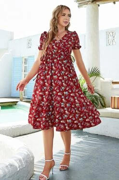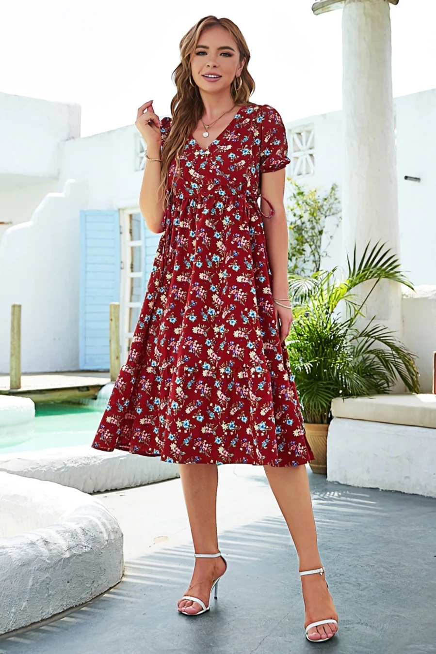 Summer new stylish batch printing inelastic v-neck waist-tuning lace-up casual midi dress
