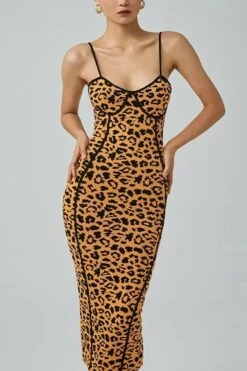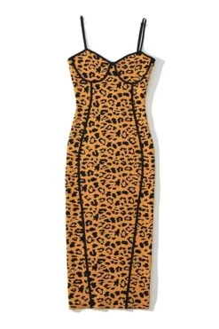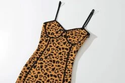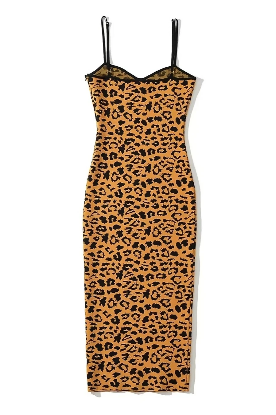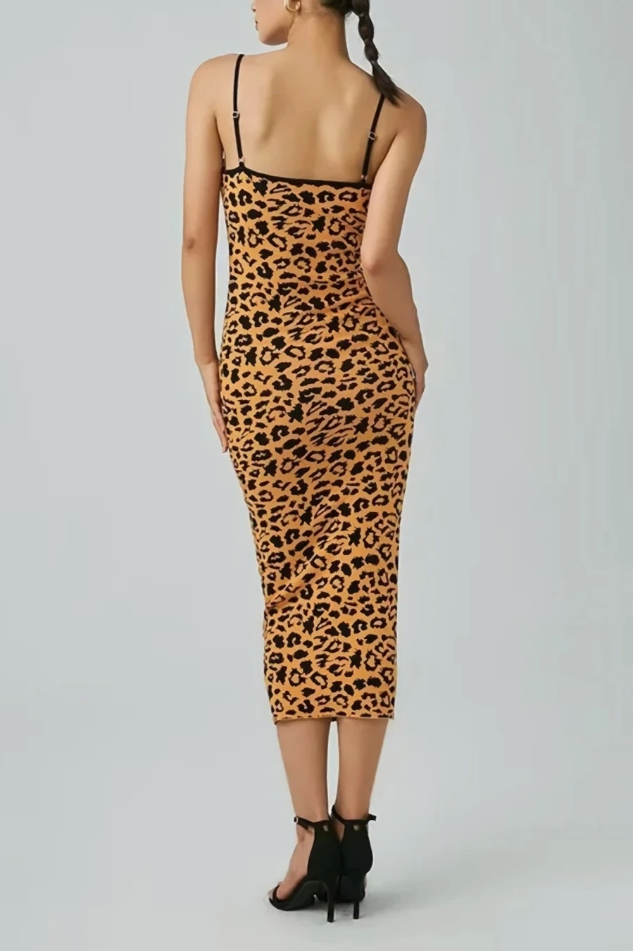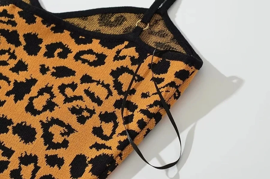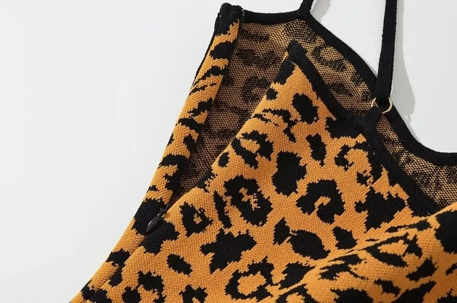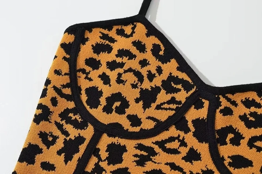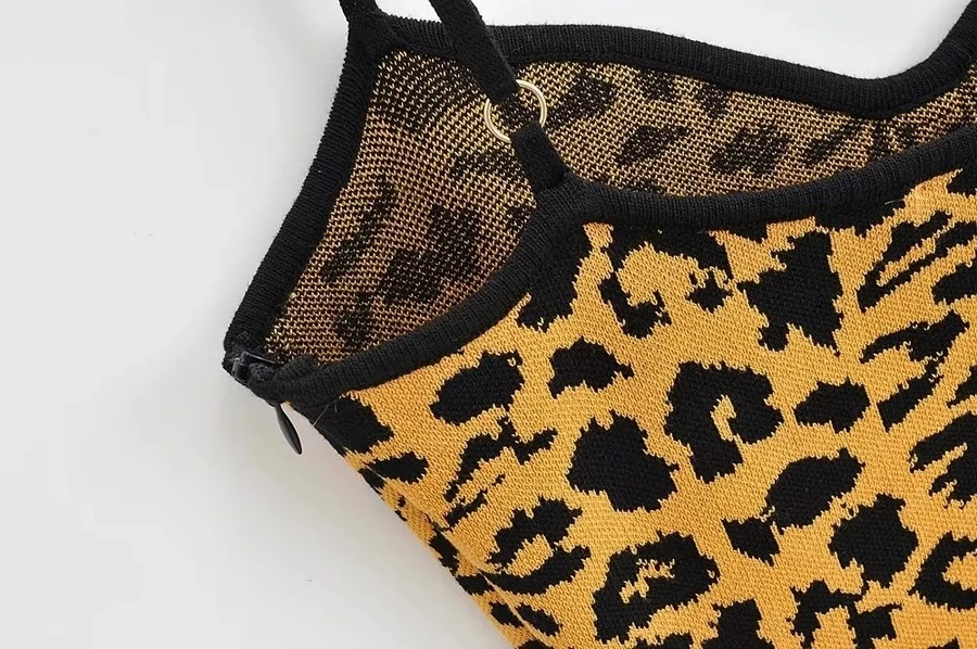 Summer new stylish leopard batch printing slight stretch slim zip-up adjustable sling knitted jacquard high quality casual midi dress