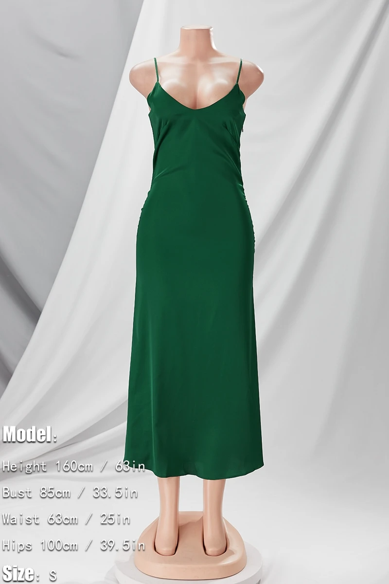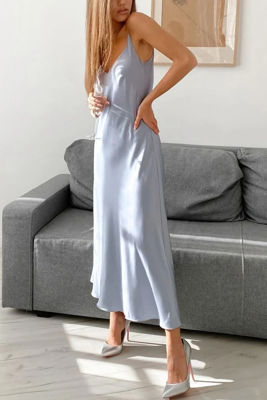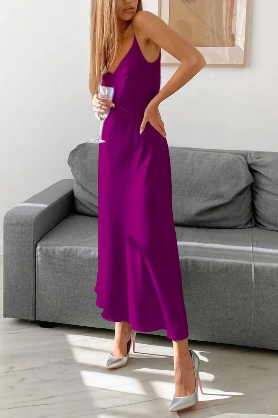 Summer new stylish seven colors solid color inelastic satin v-neck sling zip-up sexy midi dress