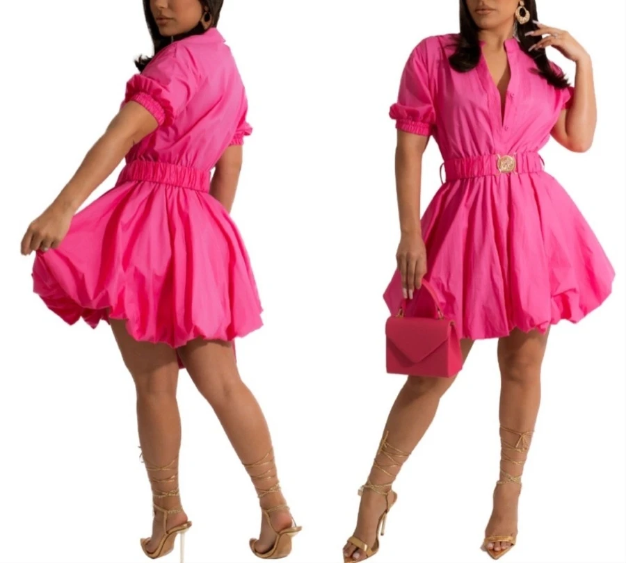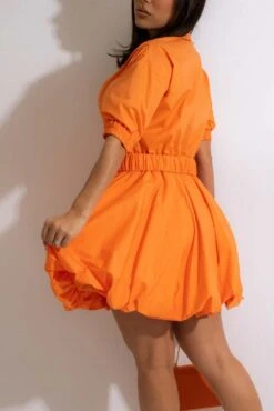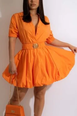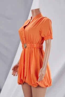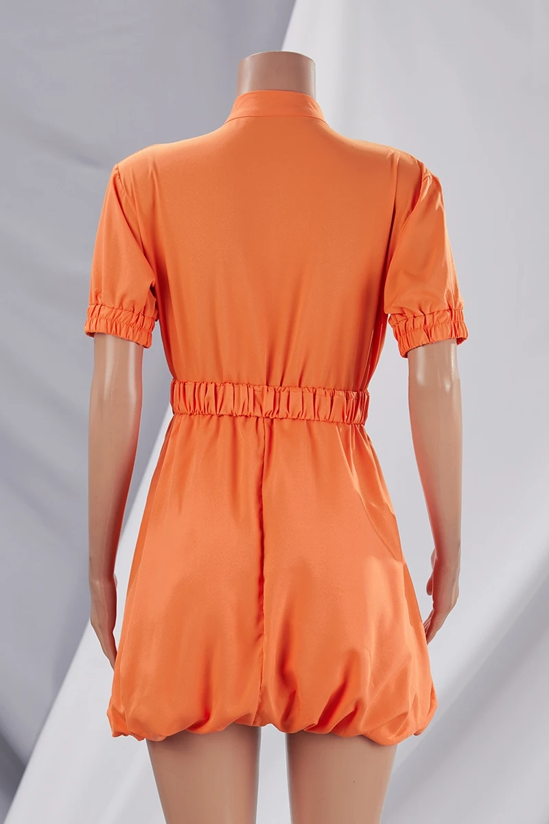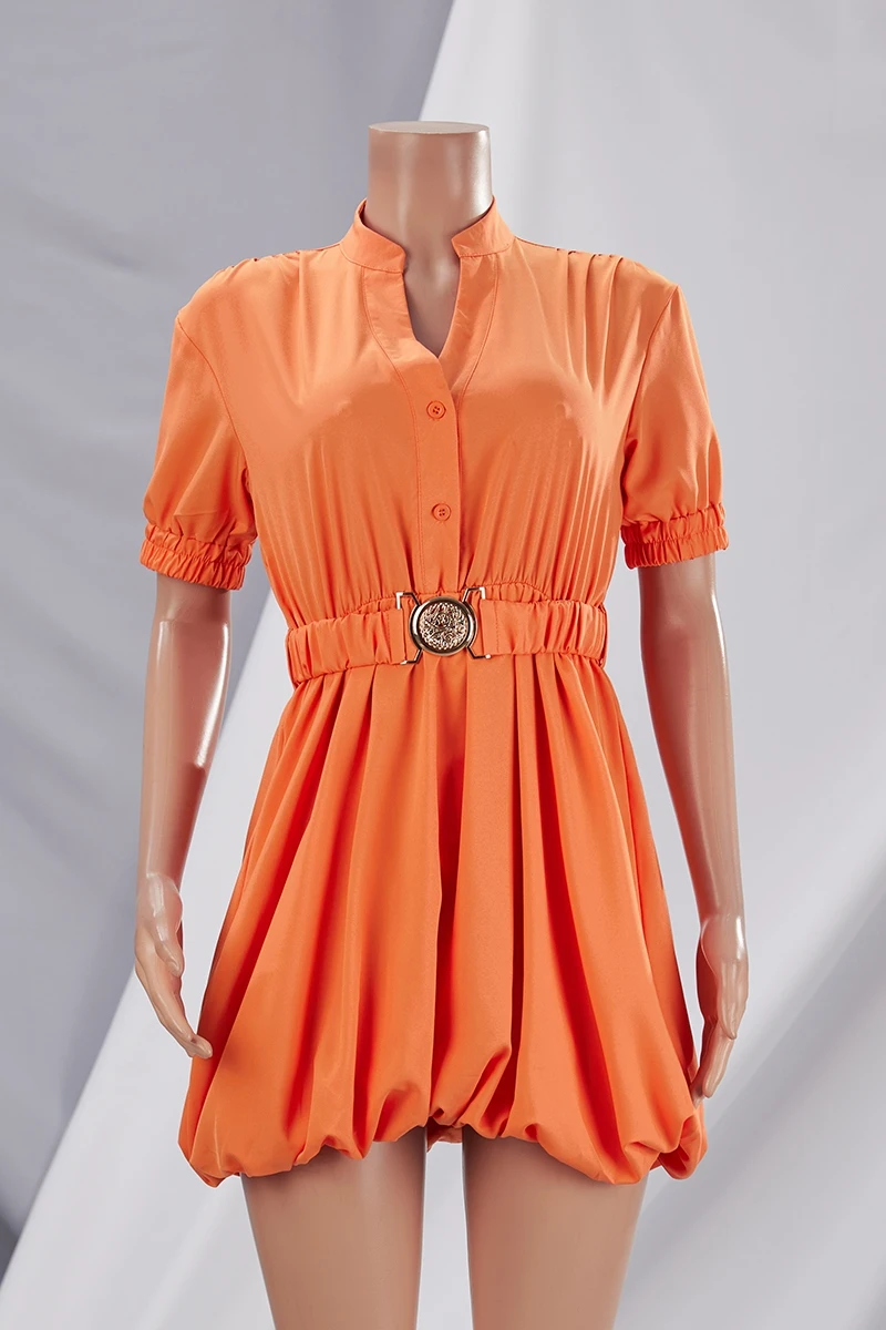 Summer new stylish simple solid color orange micro-elastic single-breasted with belt plus size casual mini dress