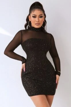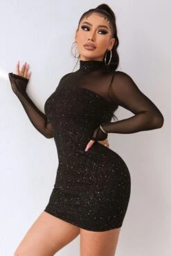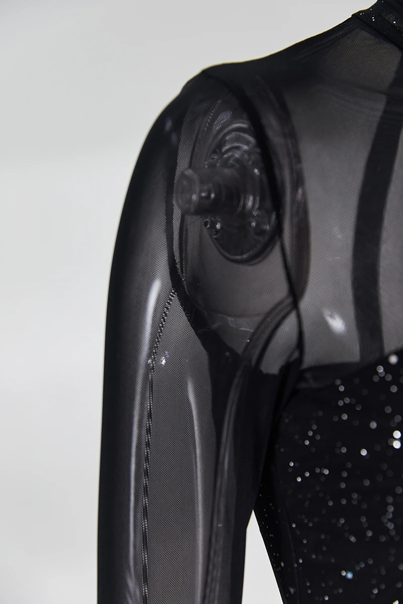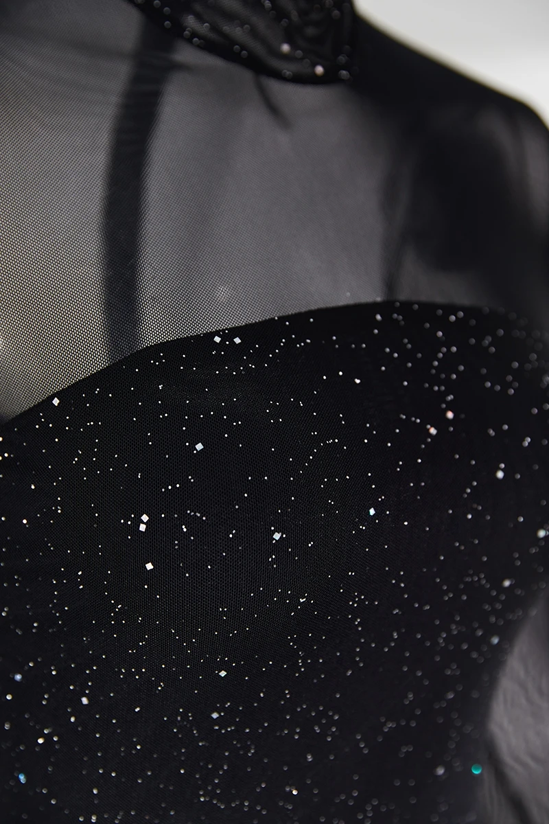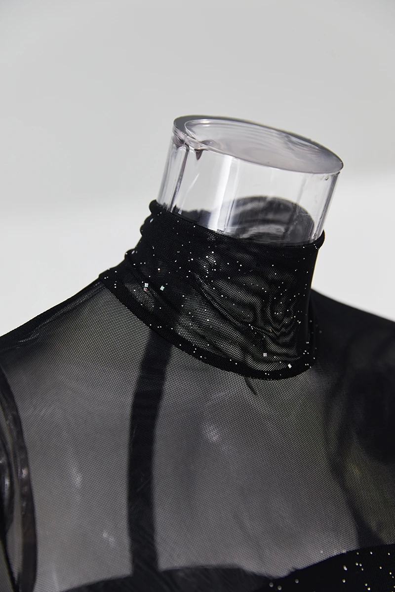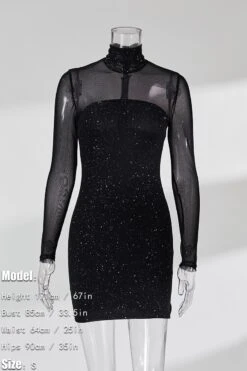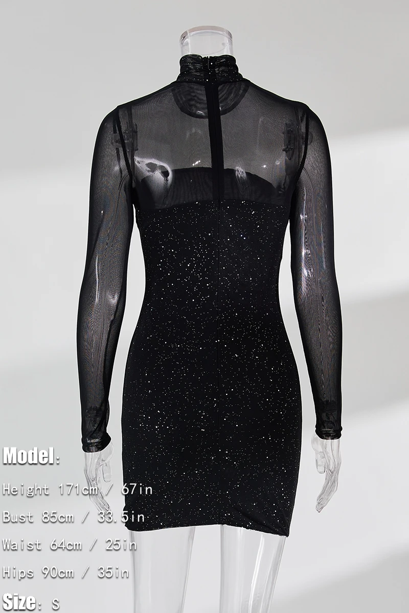 Summer new stylish solid color see through mesh patchwork glitter back zip-up sexy mini dress