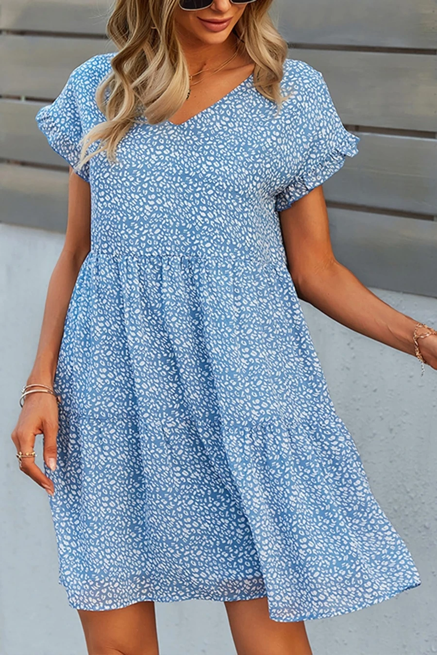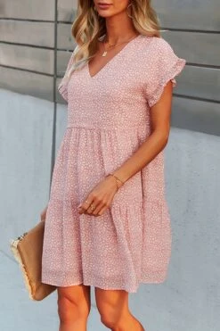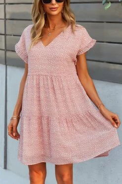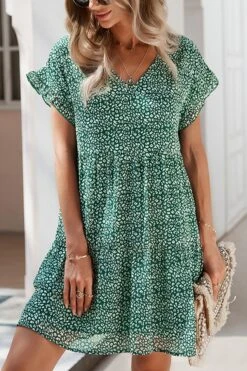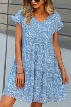 Summer new stylish three colors floral batch printing v-neck inelastic short sleeve casual mini dress