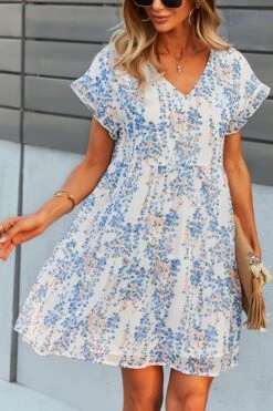 Summer new stylish three colors floral batch printing v-neck short sleeve inelastic casual mini dress