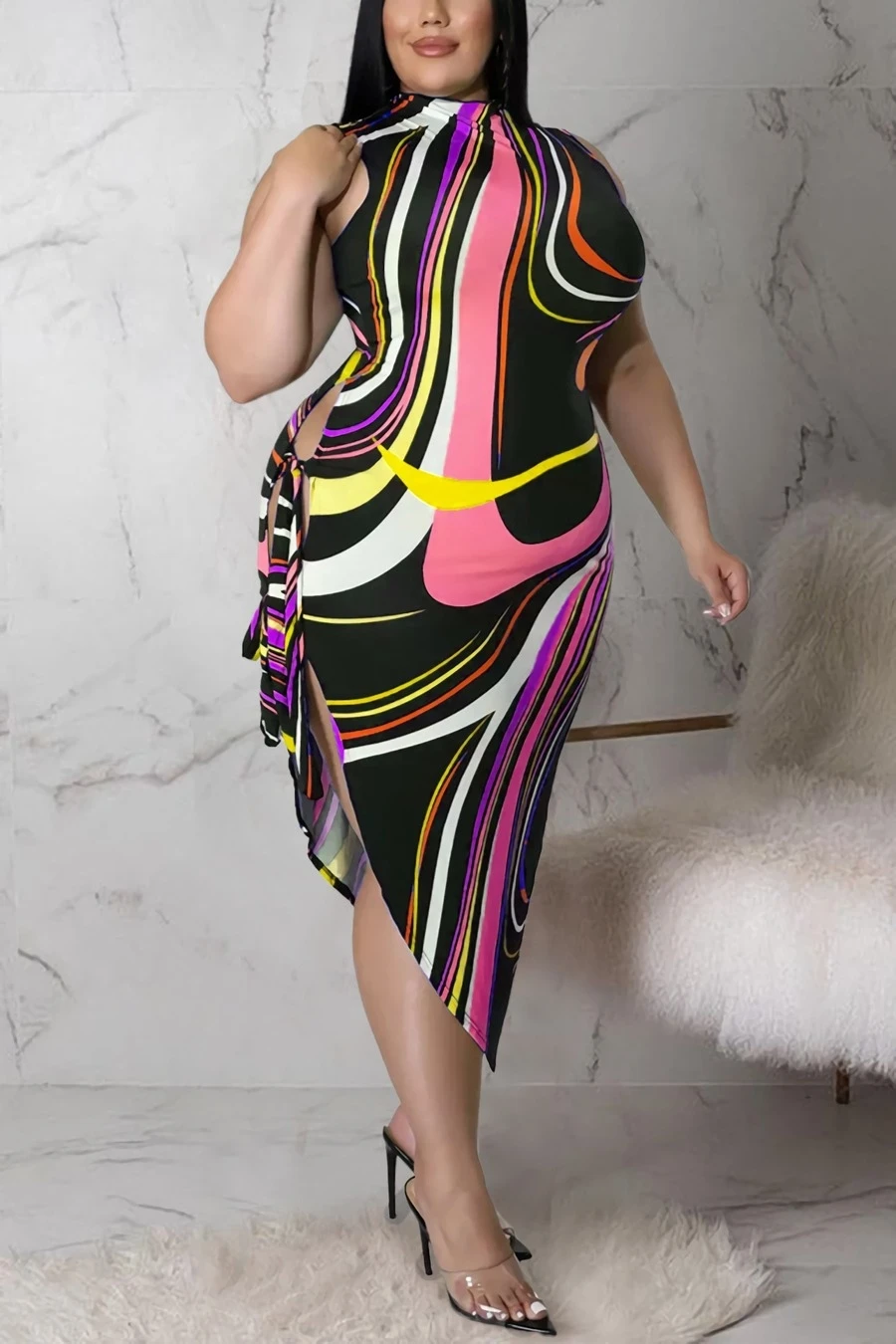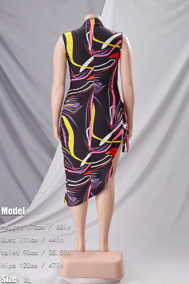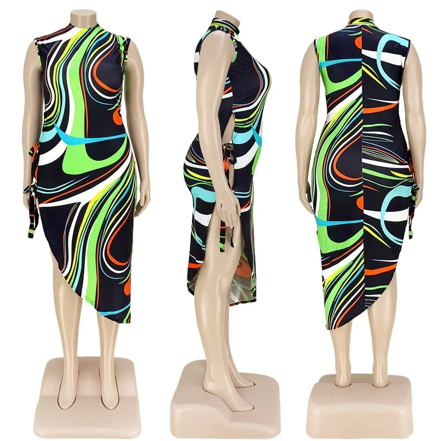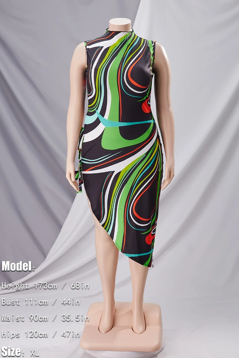 Summer new stylish XL-5XL streamline fixed printing sleeveless stretch high slit lace-up sexy midi dress