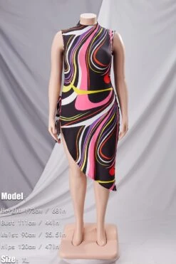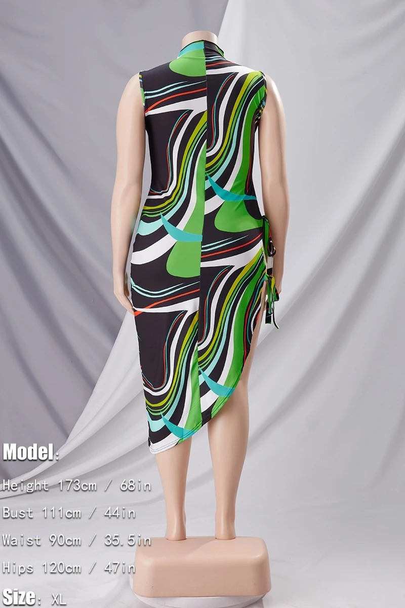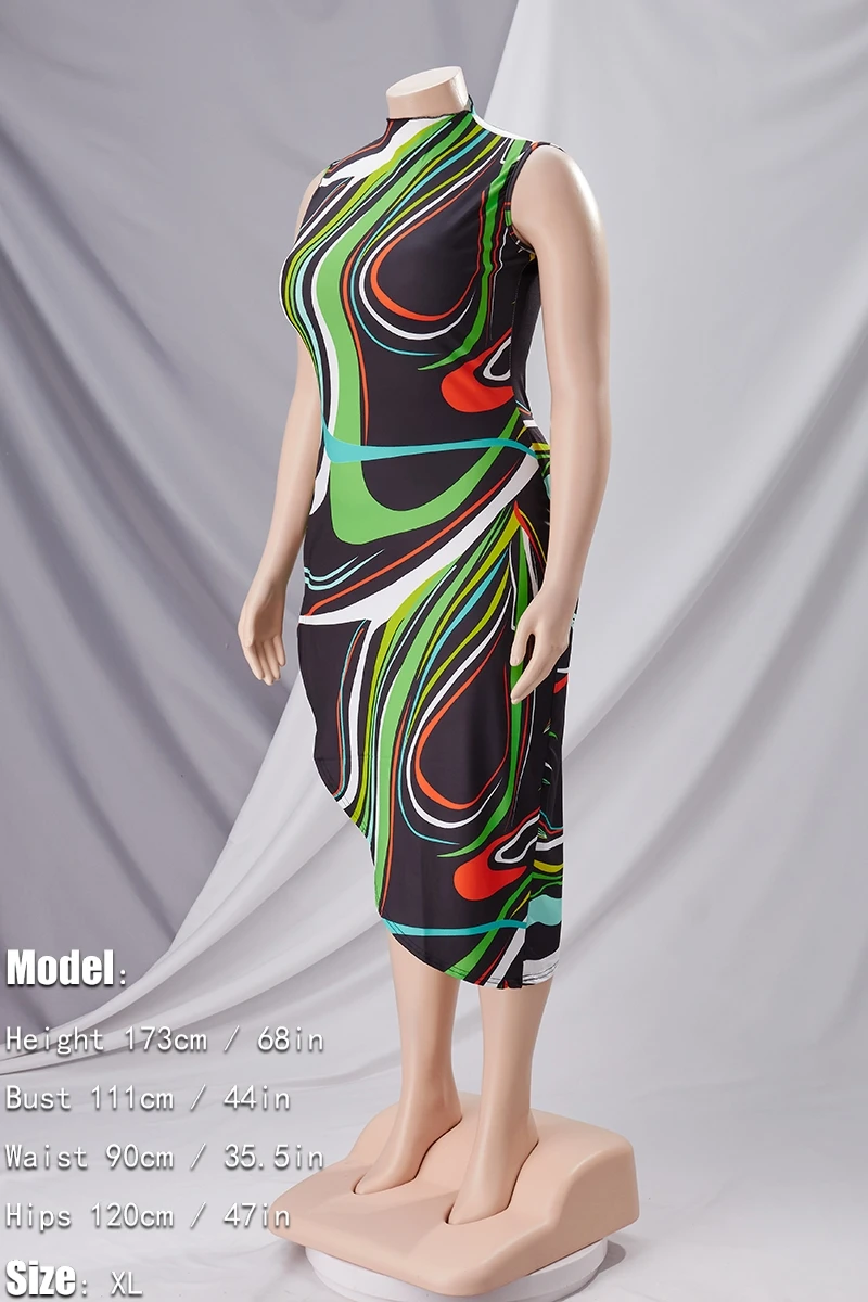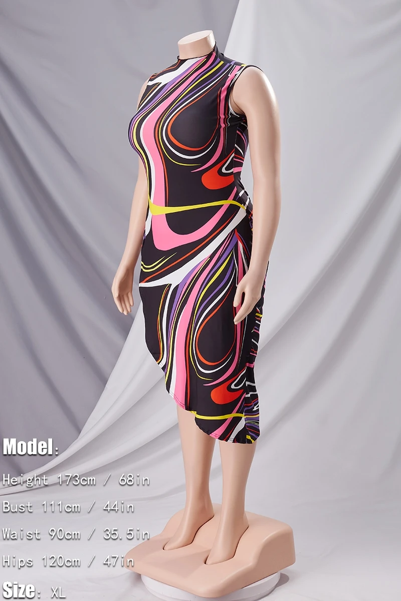 Summer new stylish XL-5XL streamline fixed printing sleeveless stretch high slit lace-up sexy midi dress