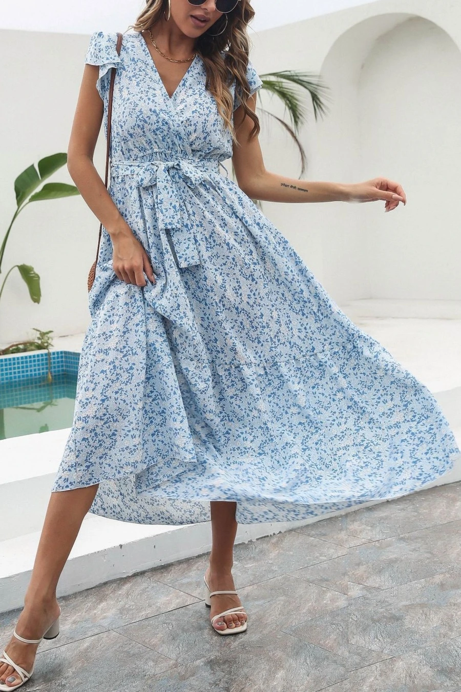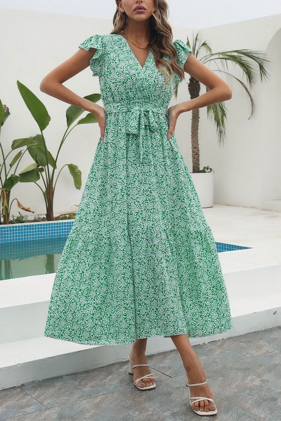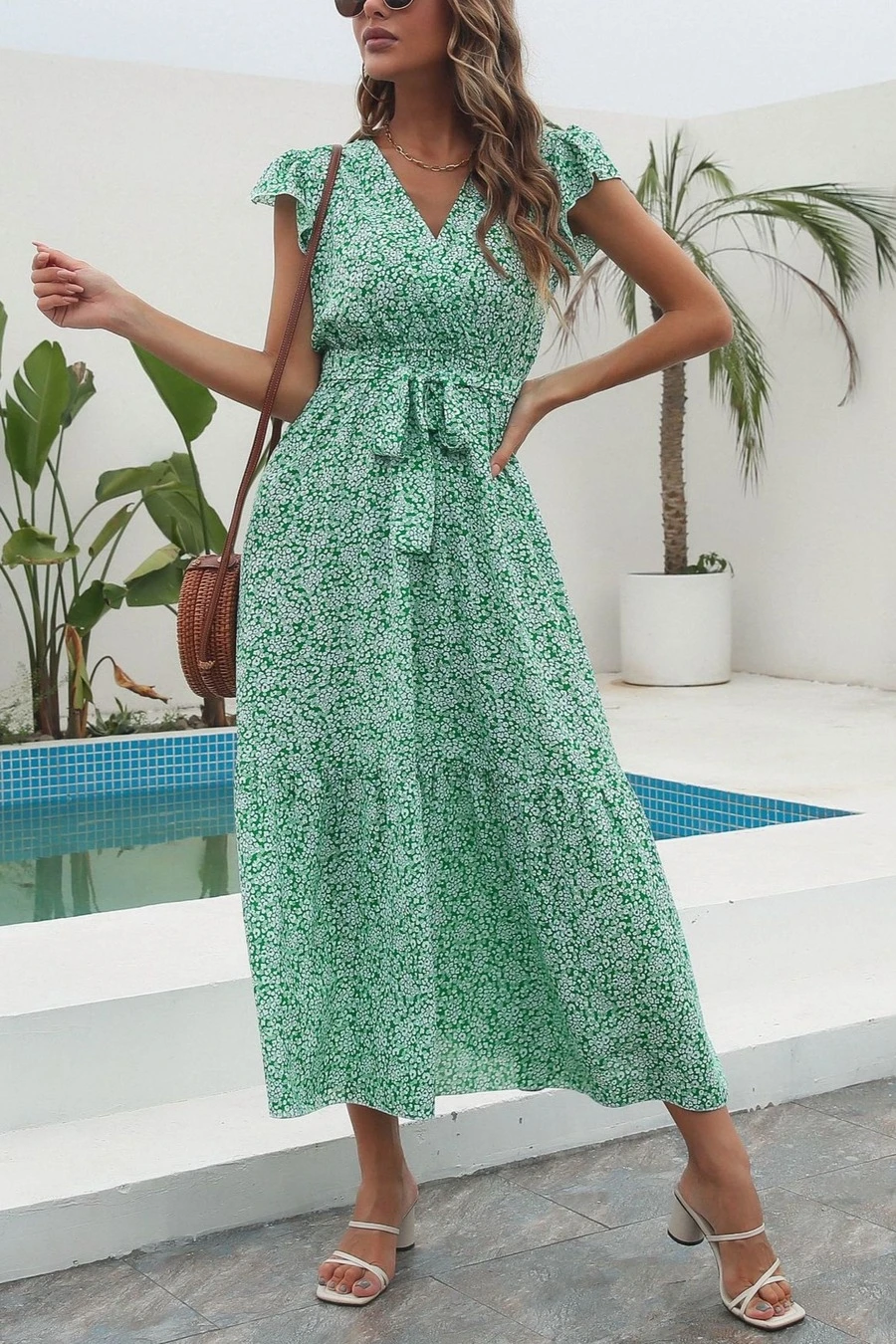 Summer new three colors allover floral printing non-stretch chiffon v-neck stylish casual midi dress with belt