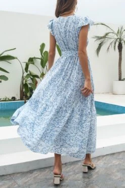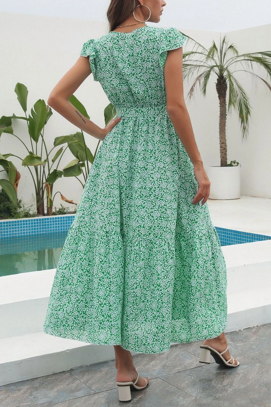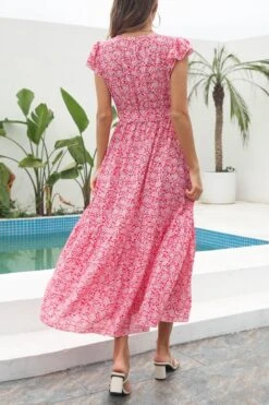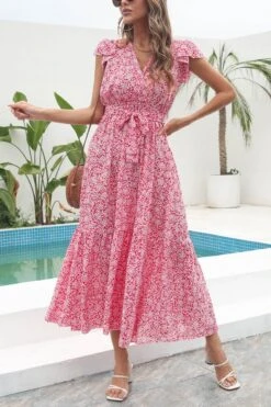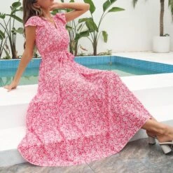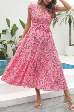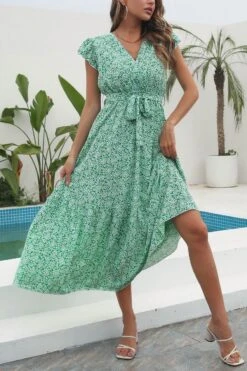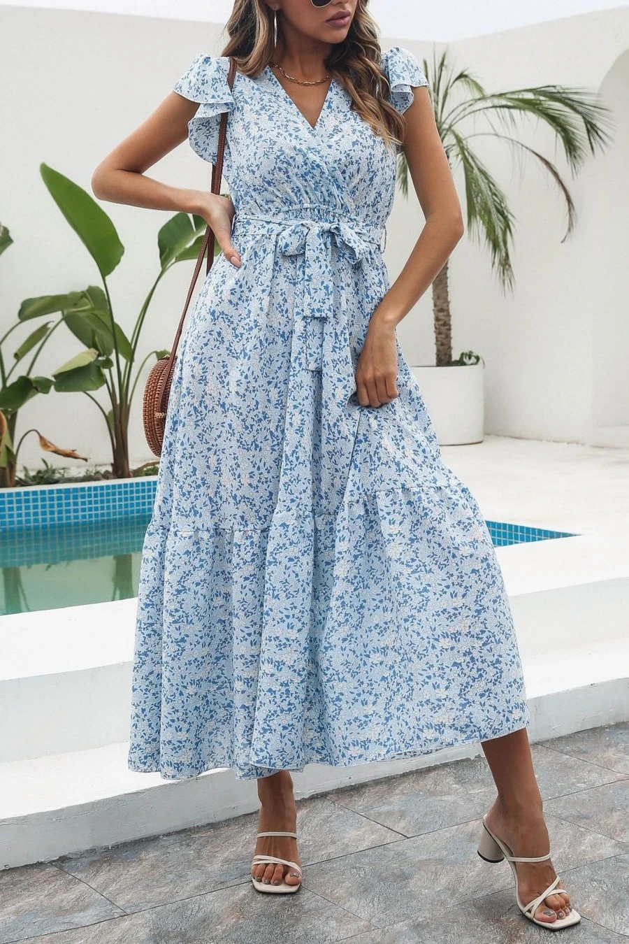 Summer new three colors allover floral printing non-stretch chiffon v-neck stylish casual midi dress with belt