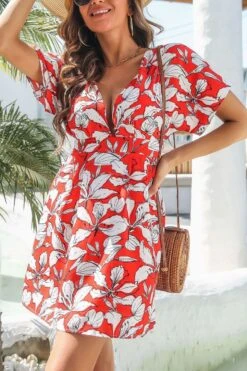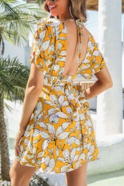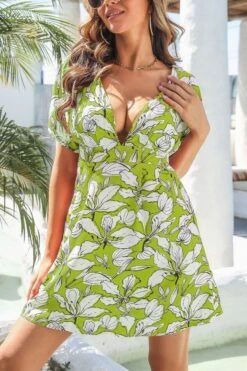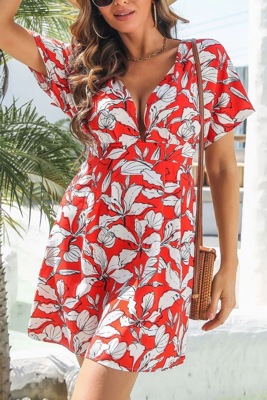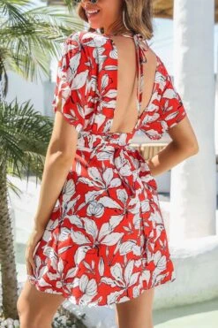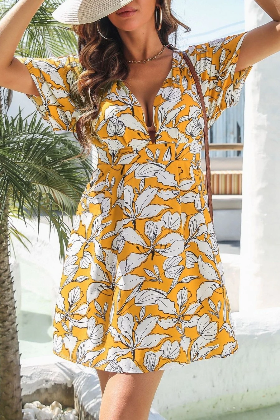 Summer new three colors allover leaf batch printing non-stretch deep v backless tied sexy vacation style mini dress