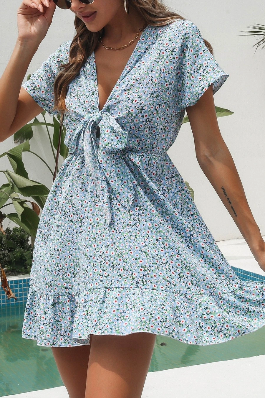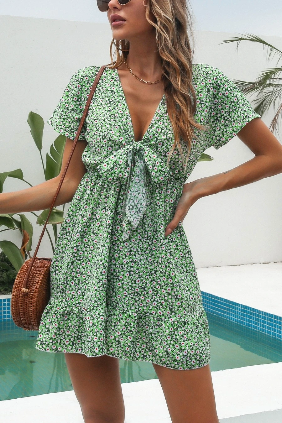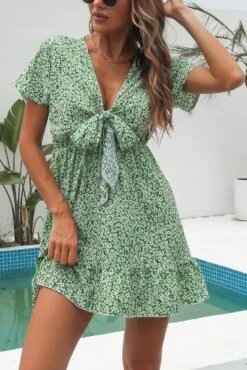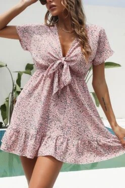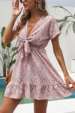 Summer new three colors non-stretch v-neck knotted short sleeves stylish vacation style mini dress