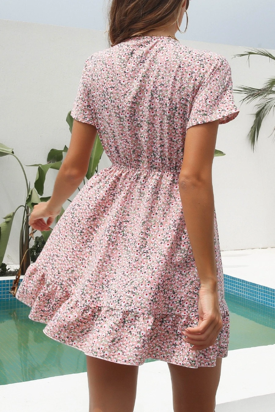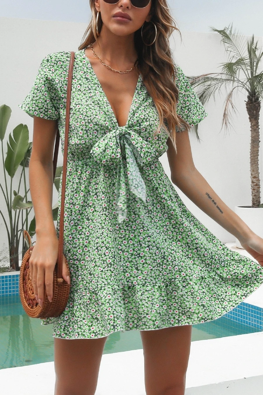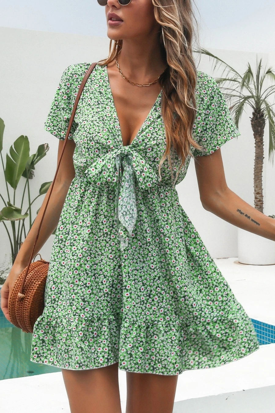 Summer new three colors non-stretch v-neck knotted short sleeves stylish vacation style mini dress