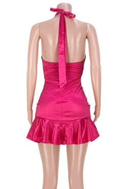 Summer new two colors solid color micro-elastic halter-neck zip-up ruffle sexy mini dress