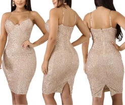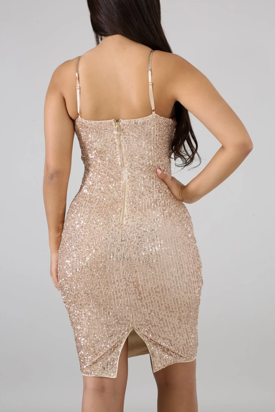 Summer solid color sequin zip-up plus size new stylish stretch sexy midi dress