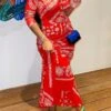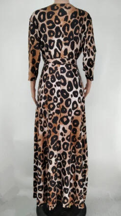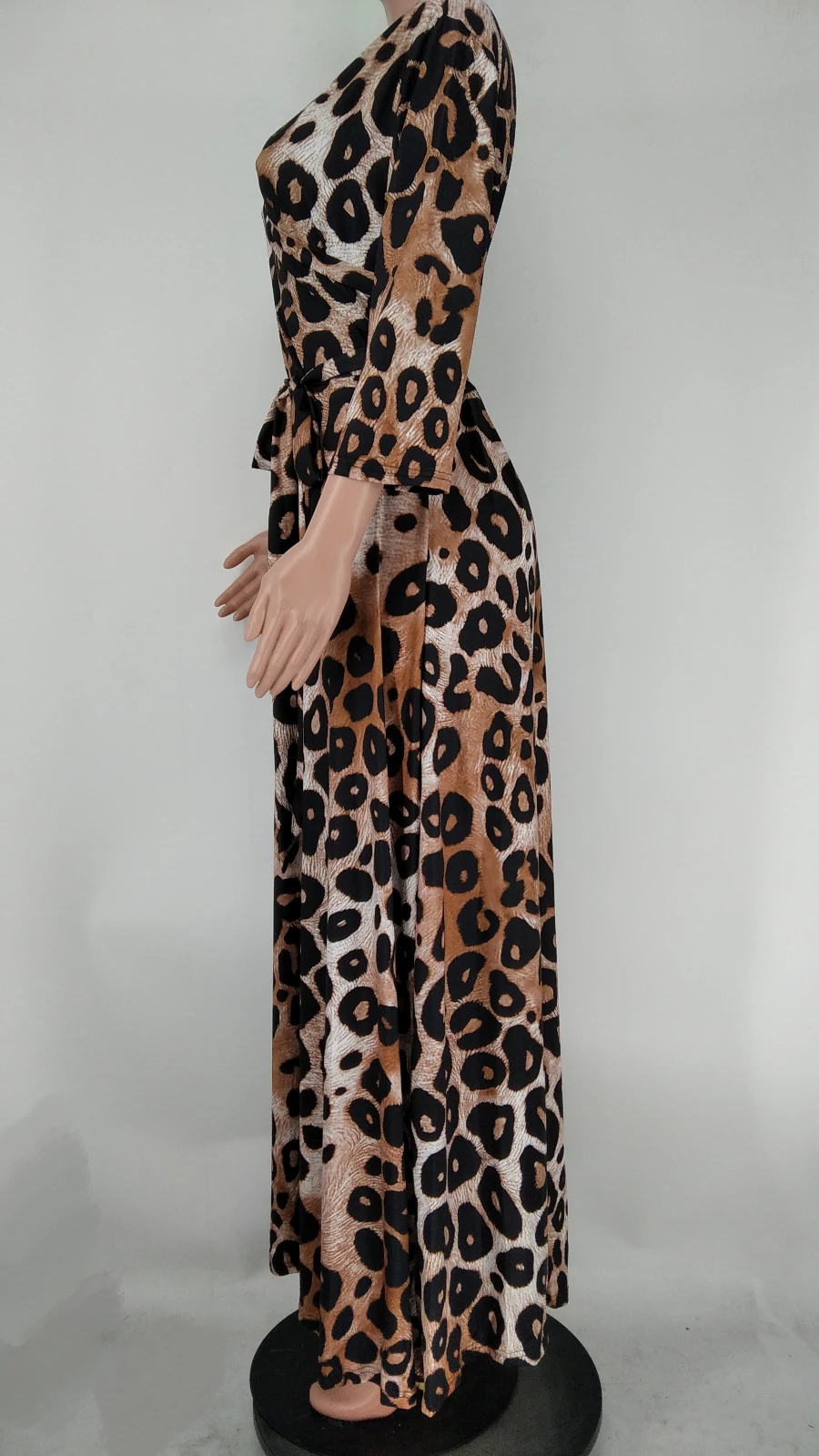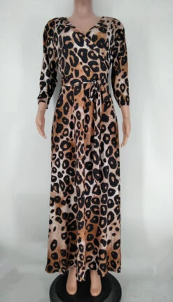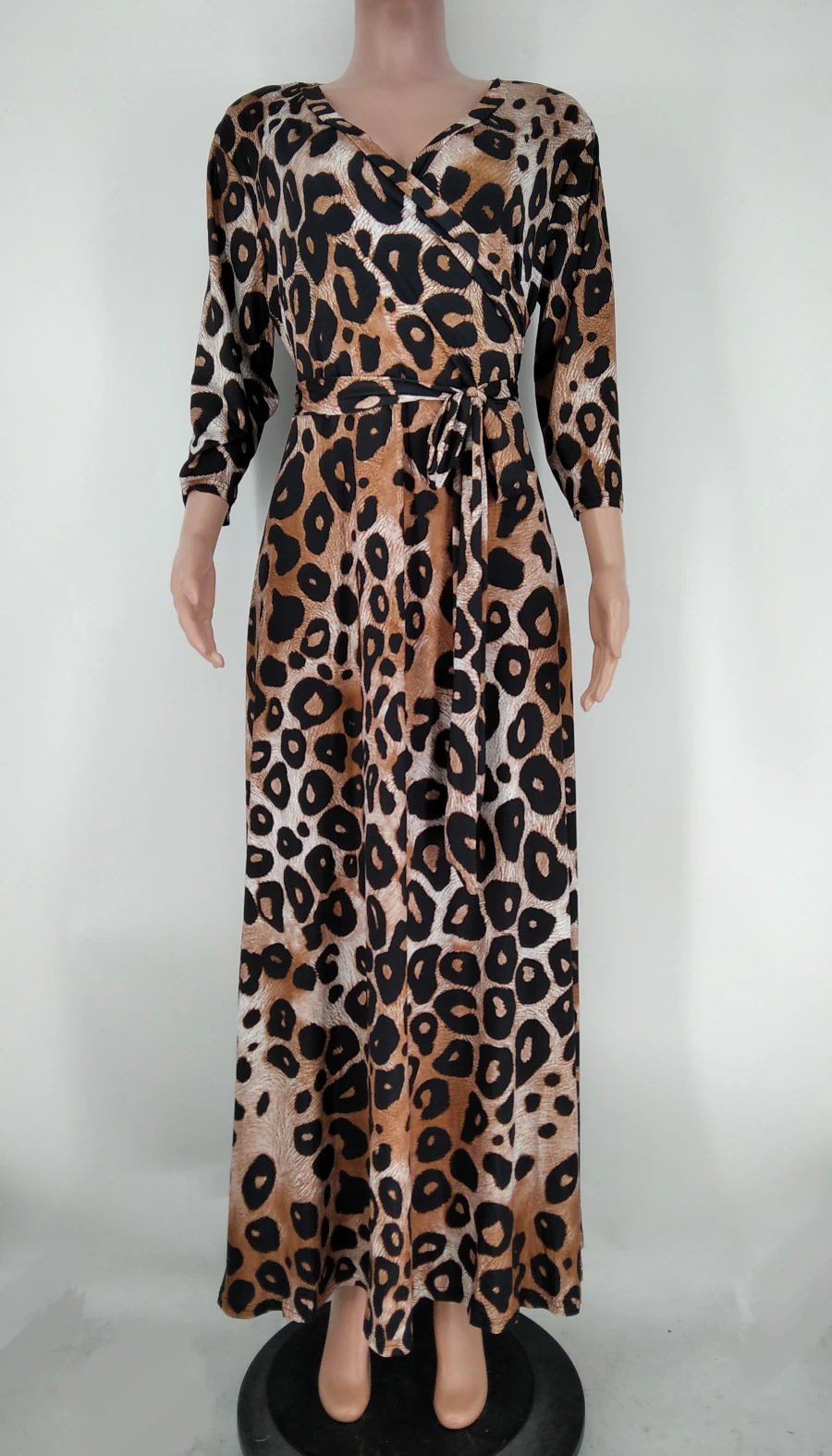 XL-5XL autumn new leopard printing stretch V-neck three-quarter-sleeve loose stylish maxi dress with belt