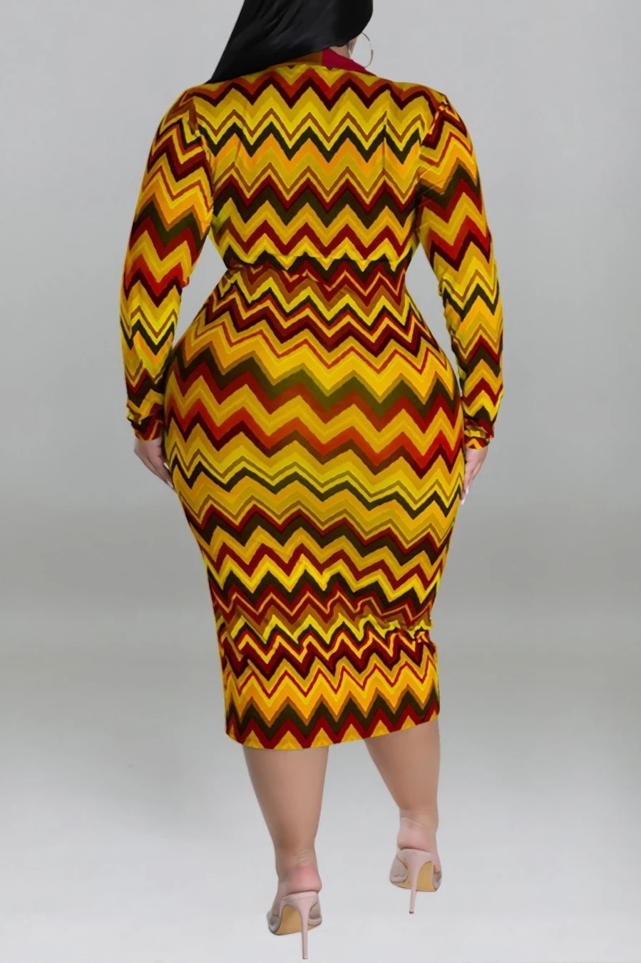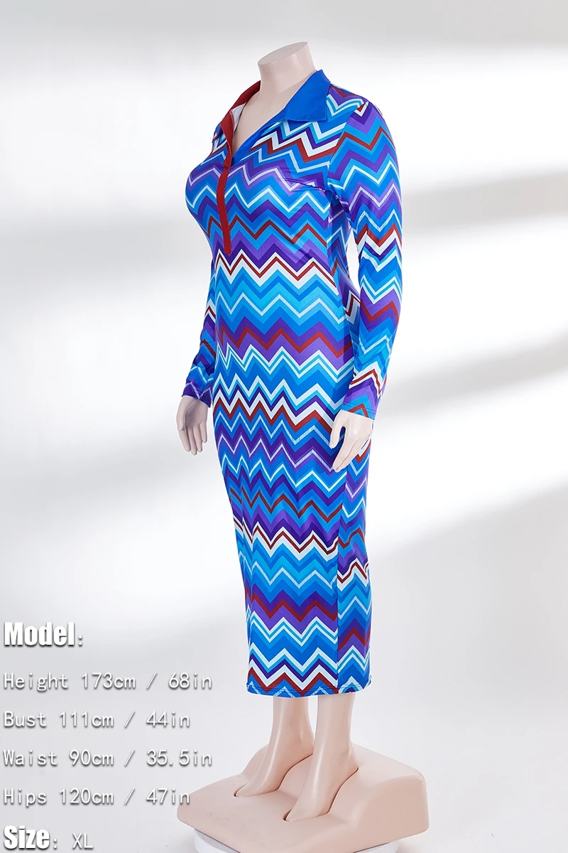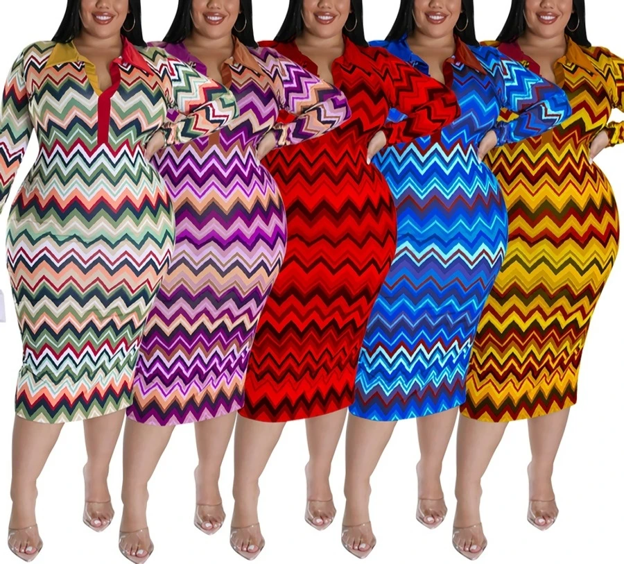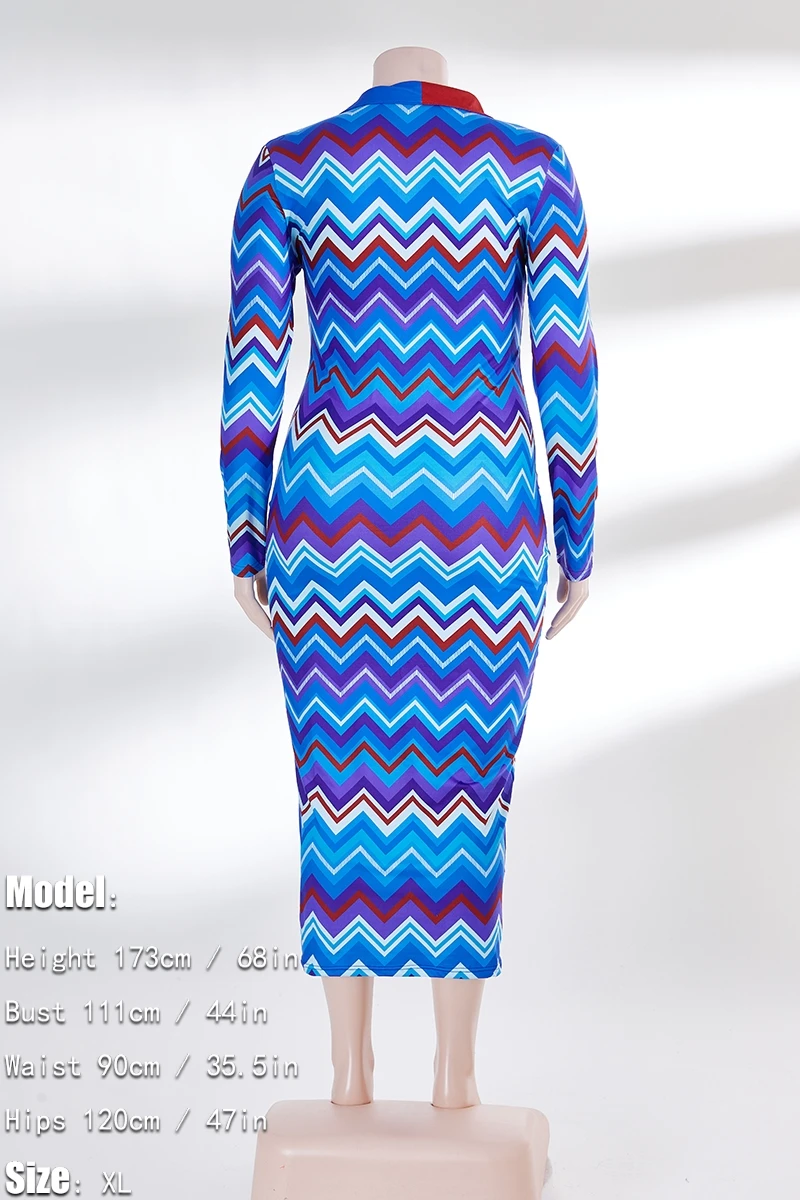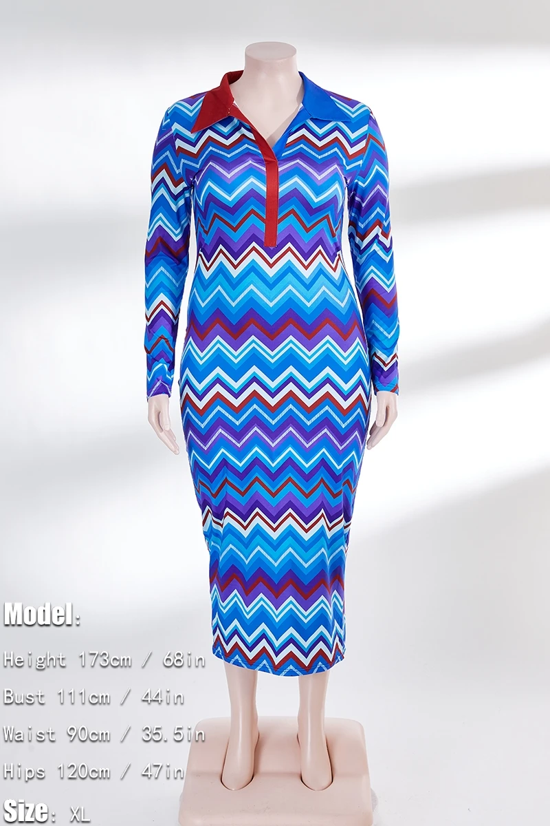 XL-5XL plus size autumn new 5 colors wave printing stretch long sleeves stylish midi dress