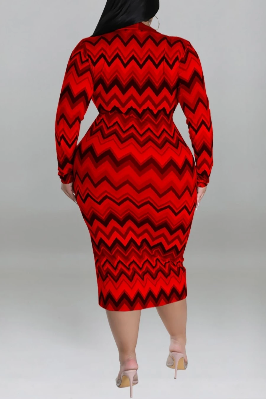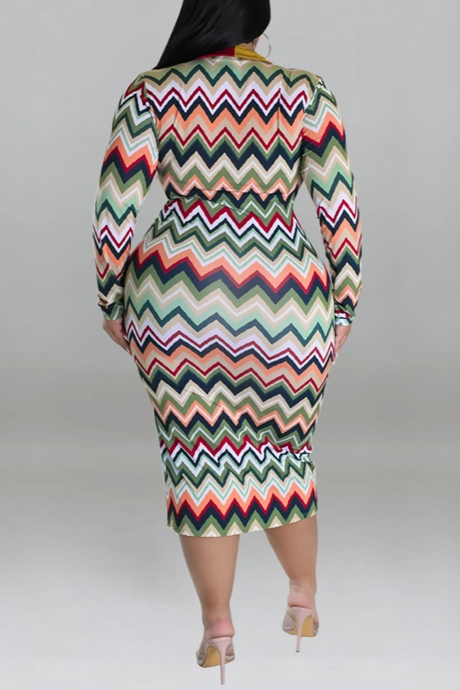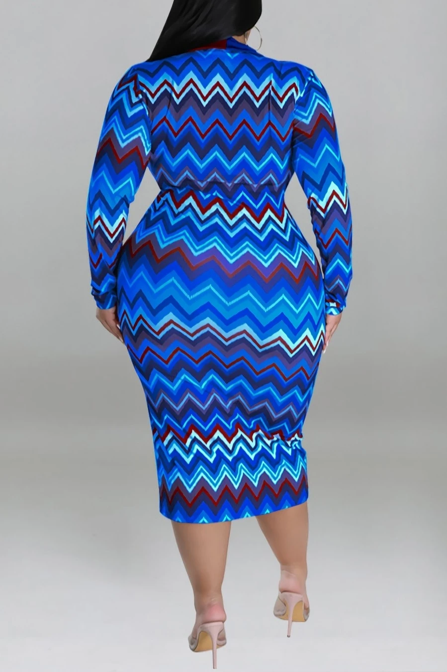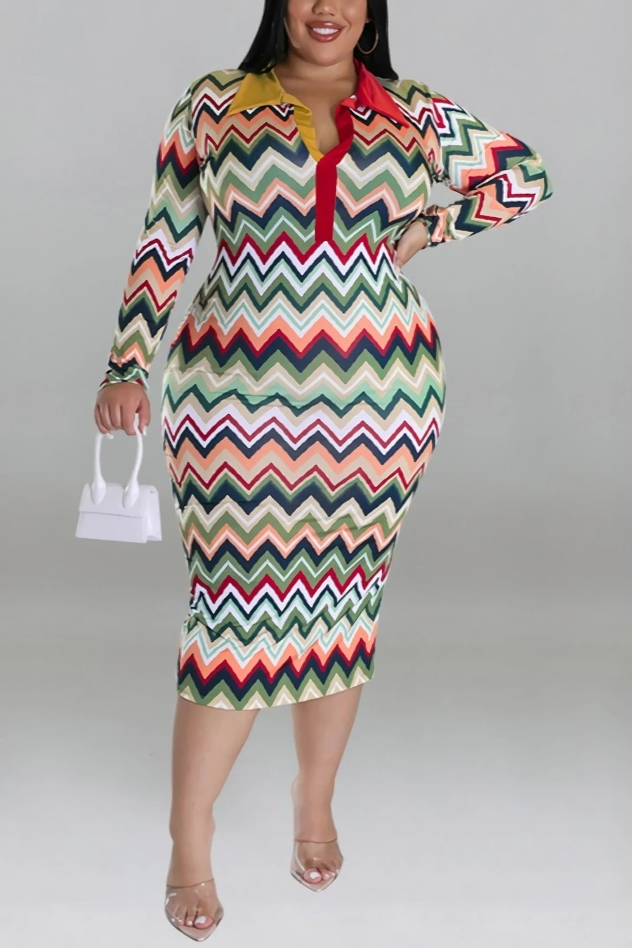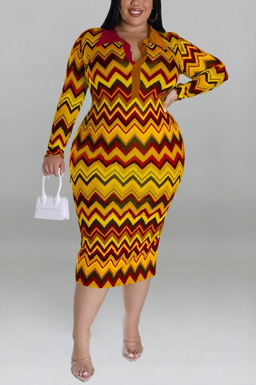 XL-5XL plus size autumn new 5 colors wave printing stretch long sleeves stylish midi dress