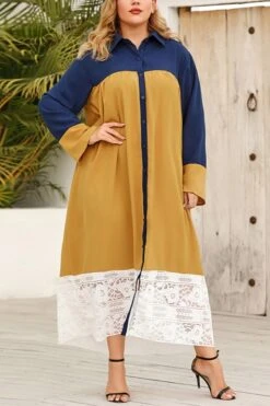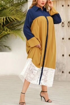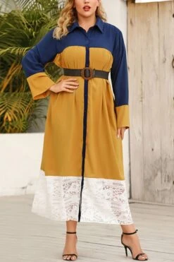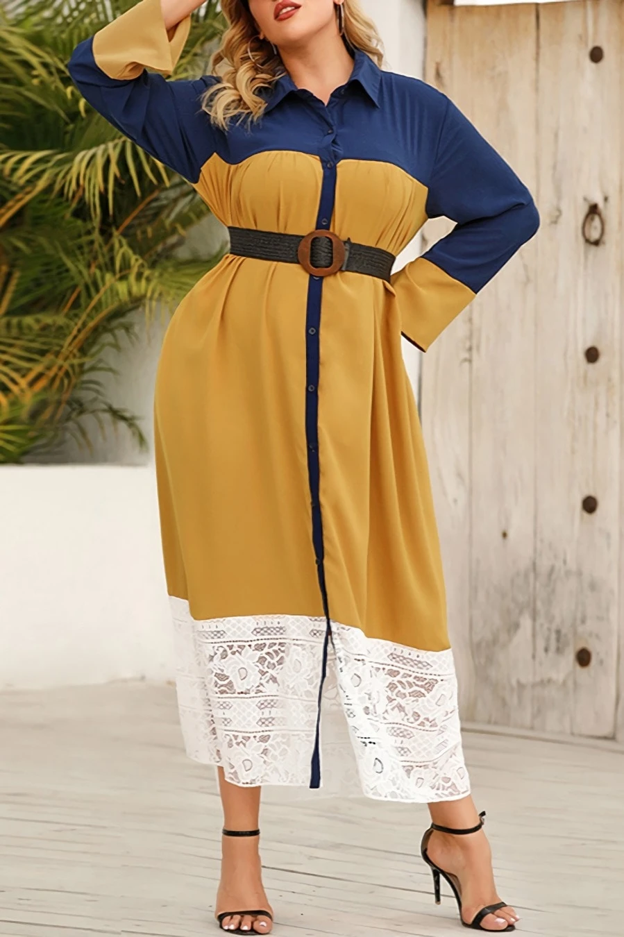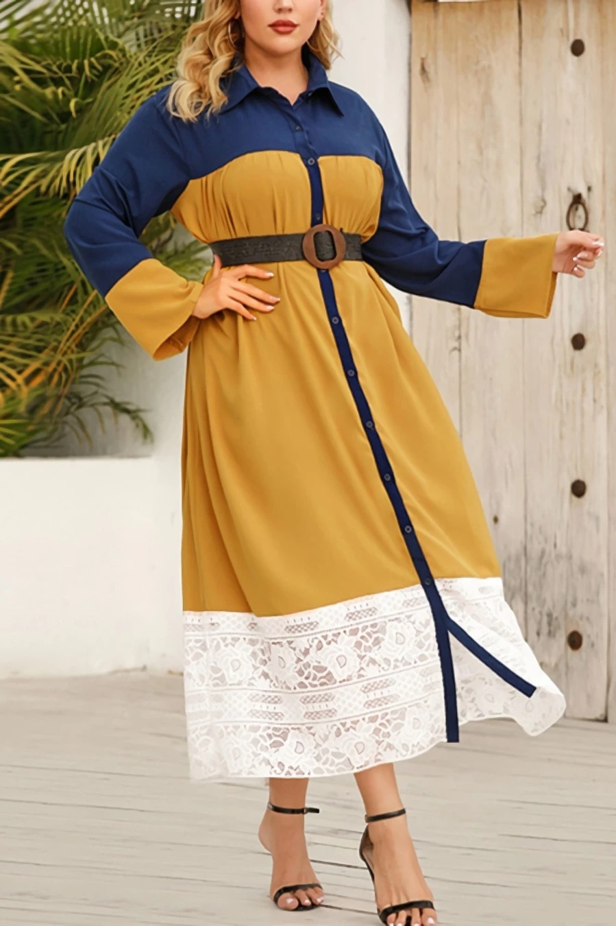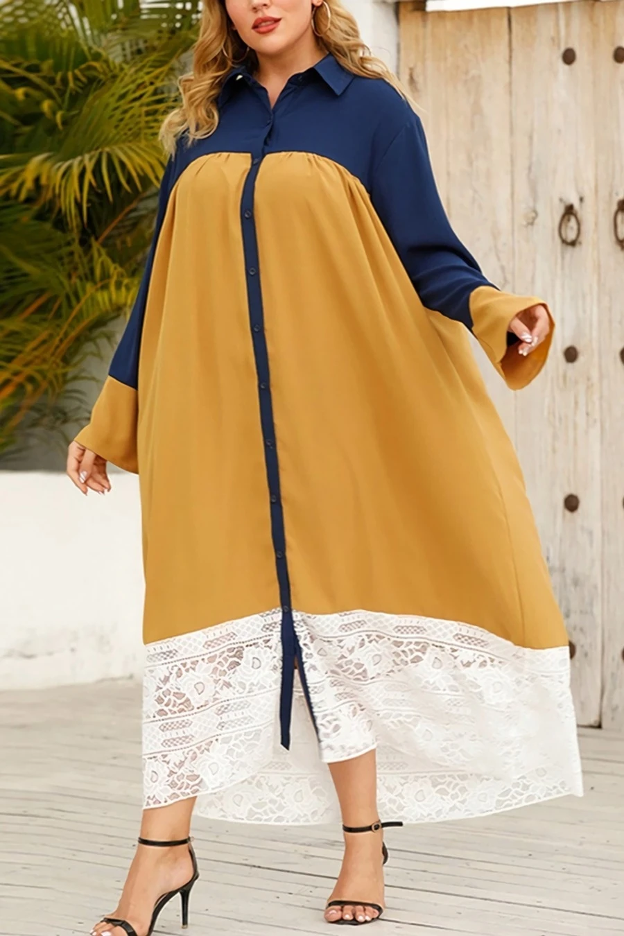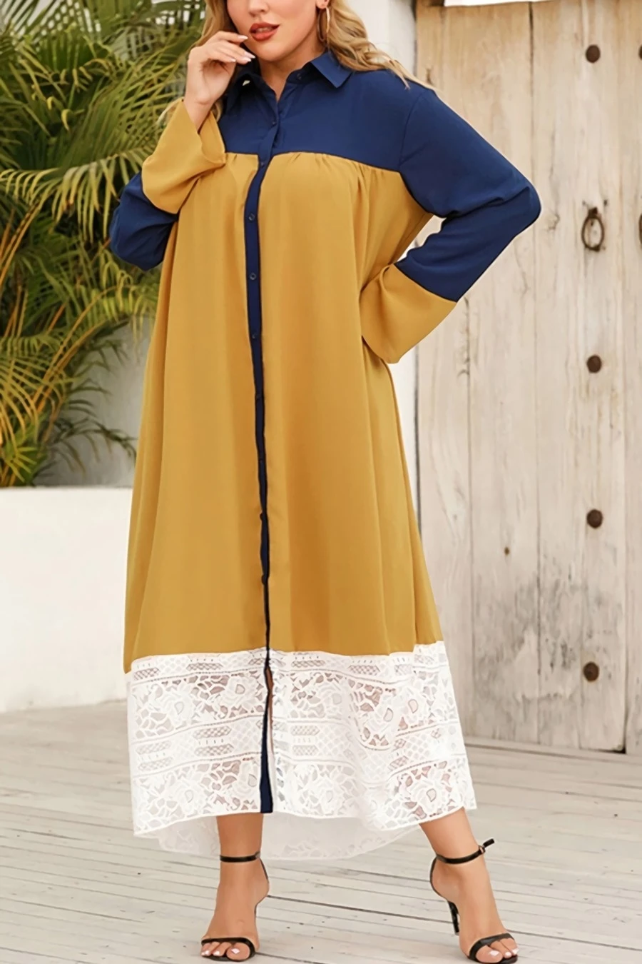 XL-5XL plus size autumn new stylish contrast color lapel inelastic long sleeve button stitching lace hem high quality casual maxi dress