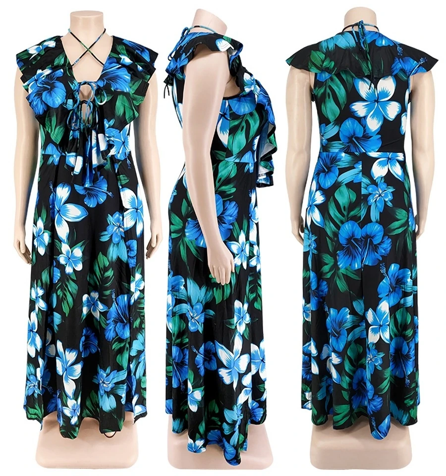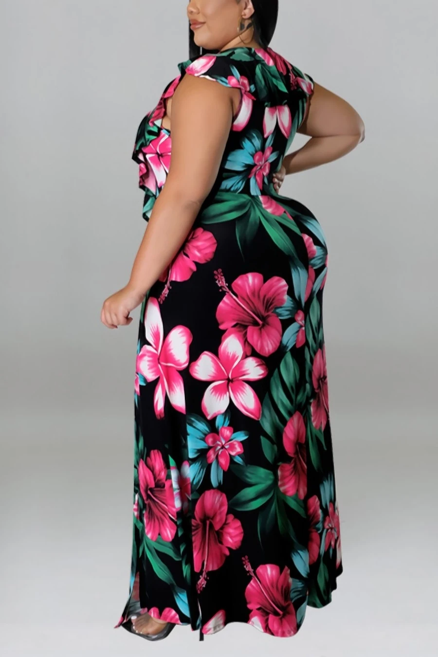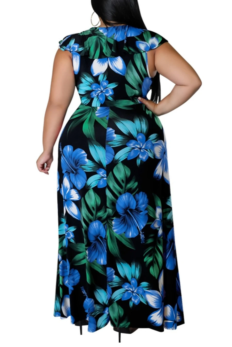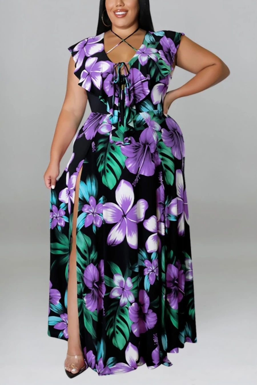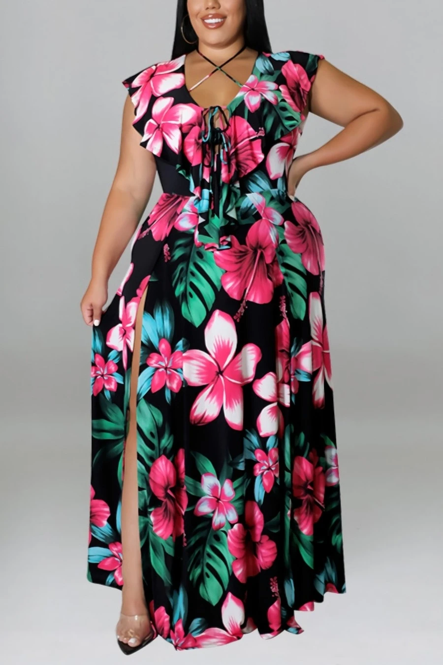 XL-5XL summer new plus size 4 colors allover flower & leaf batch printing stretch deep v tied ruffle high split stylish maxi dress