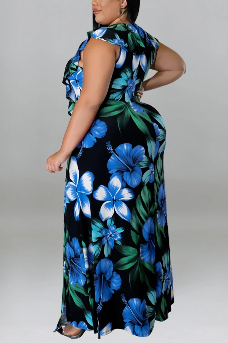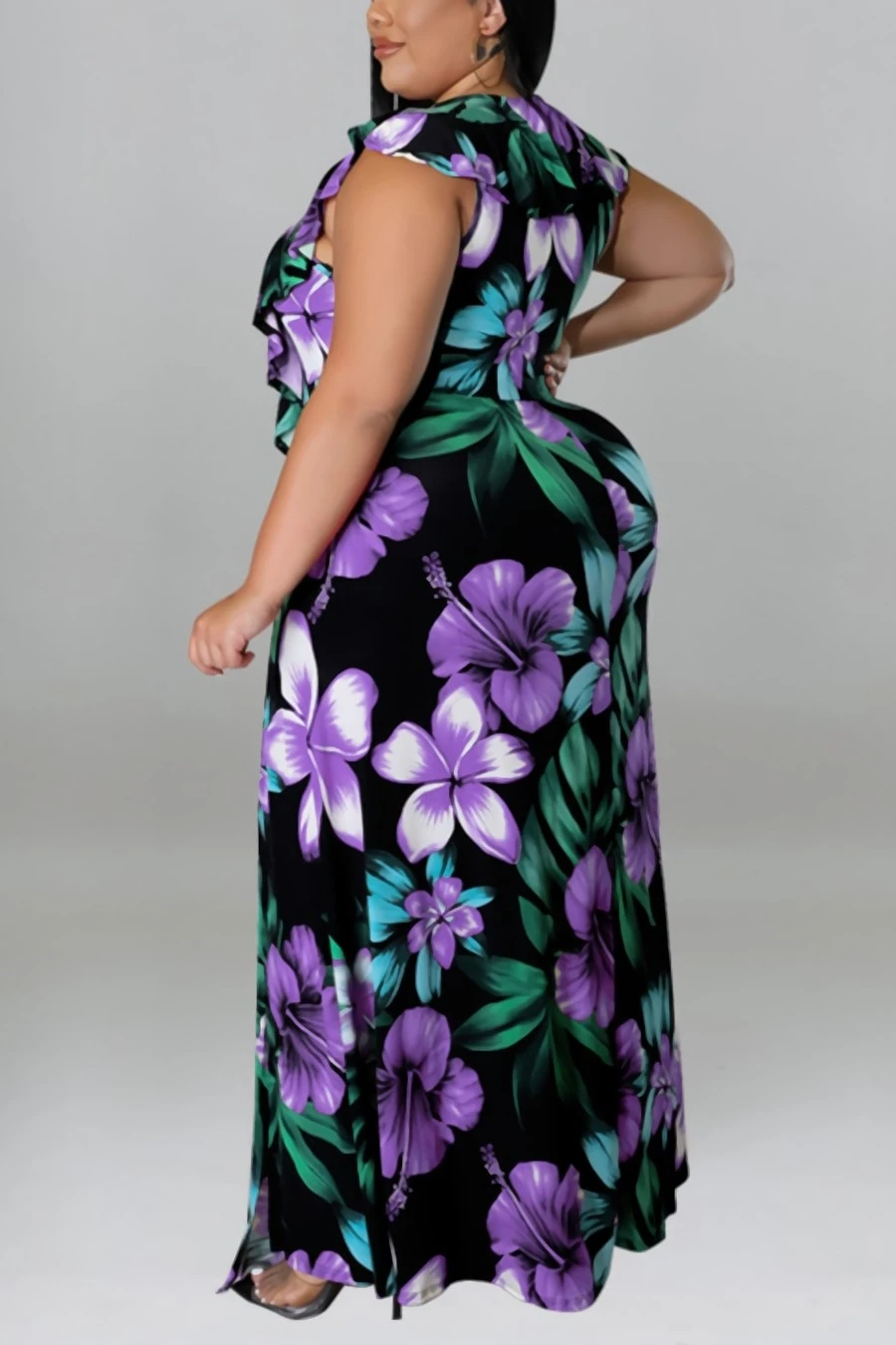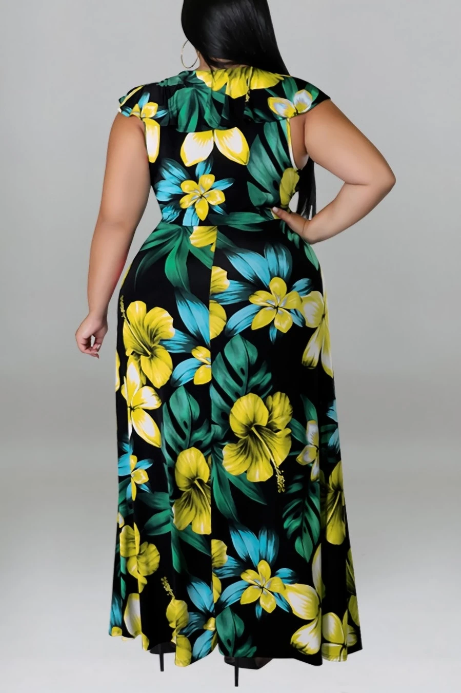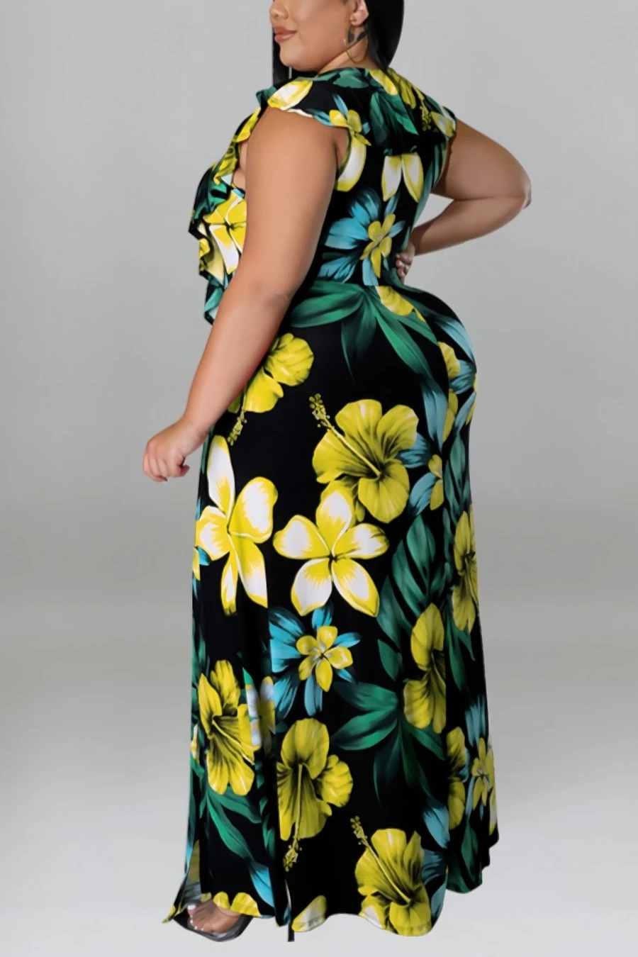 XL-5XL summer new plus size 4 colors allover flower & leaf batch printing stretch deep v tied ruffle high split stylish maxi dress