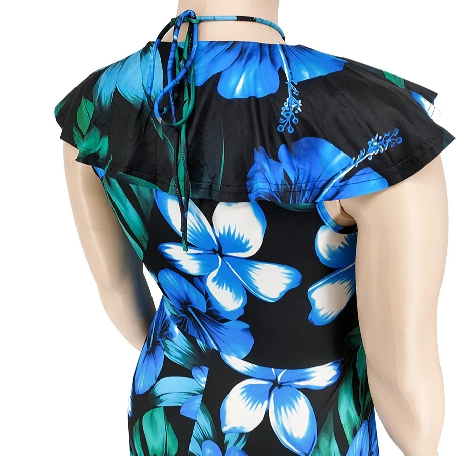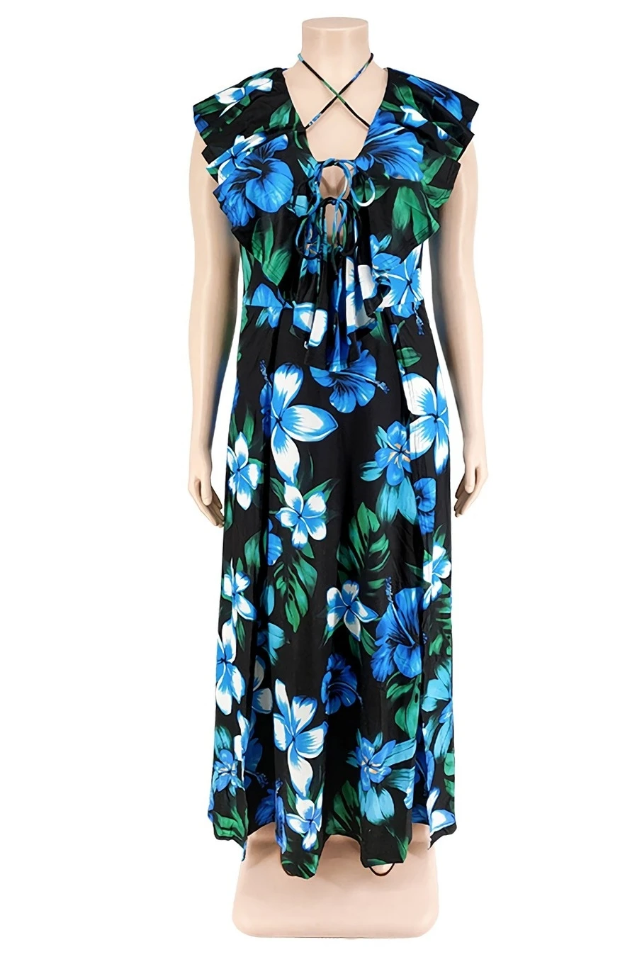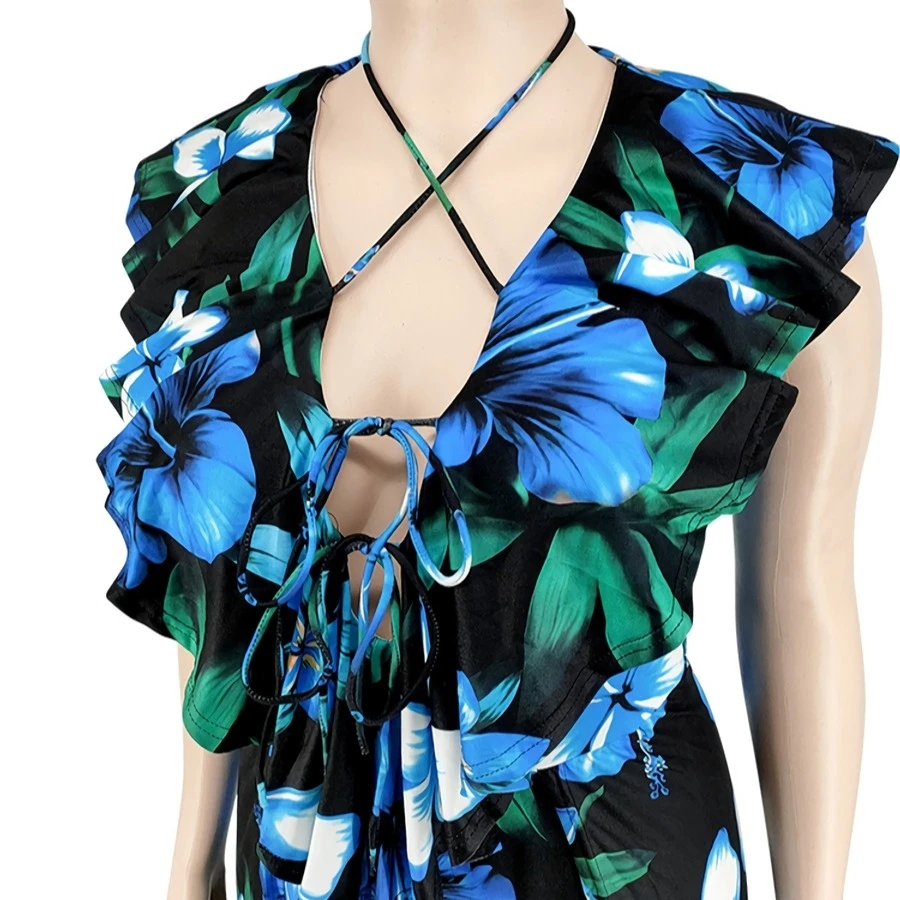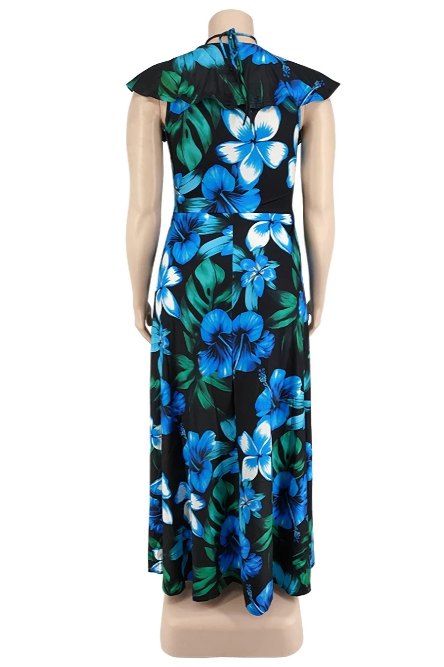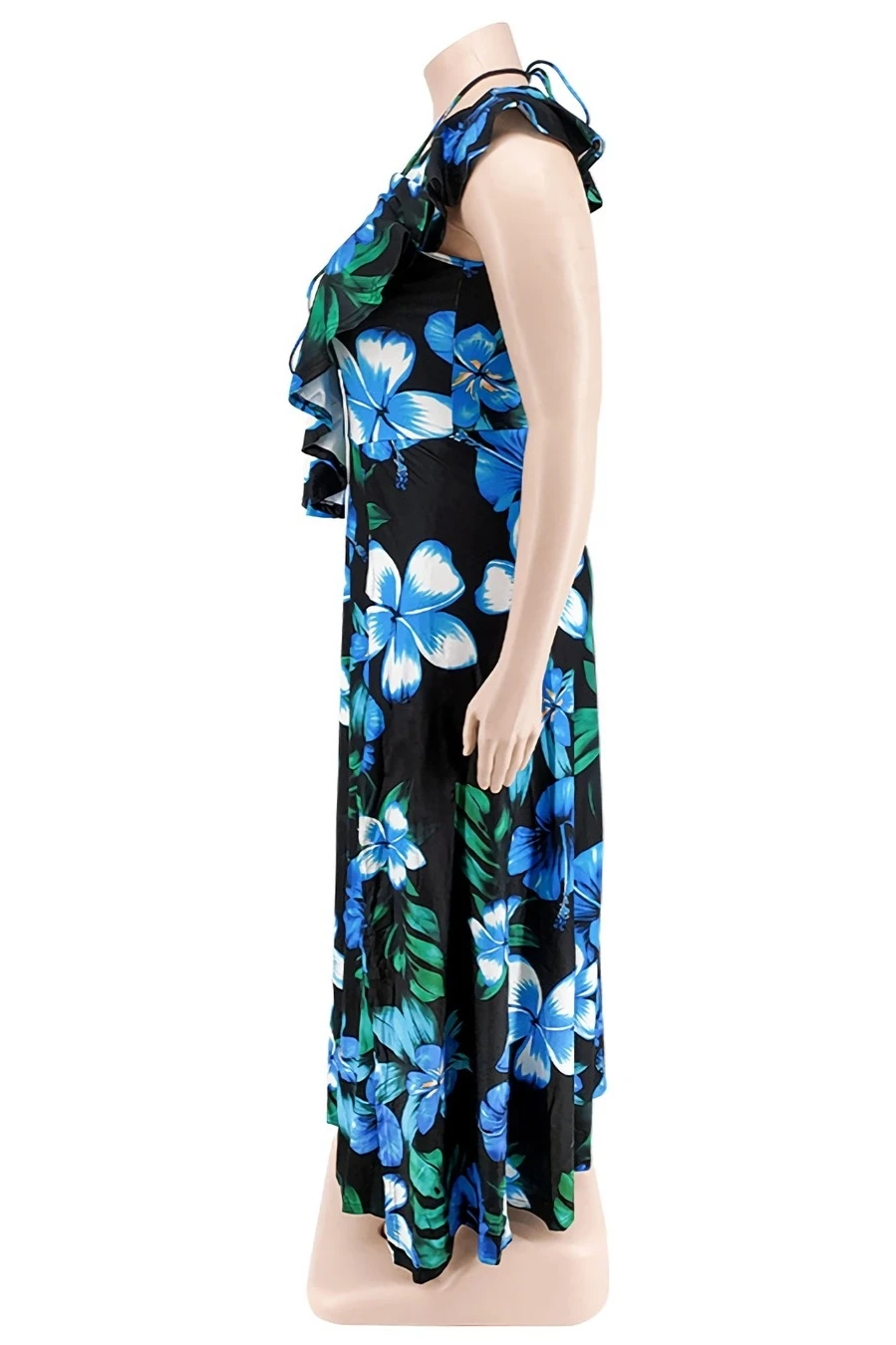 XL-5XL summer new plus size 4 colors allover flower & leaf batch printing stretch deep v tied ruffle high split stylish maxi dress