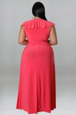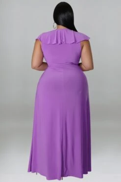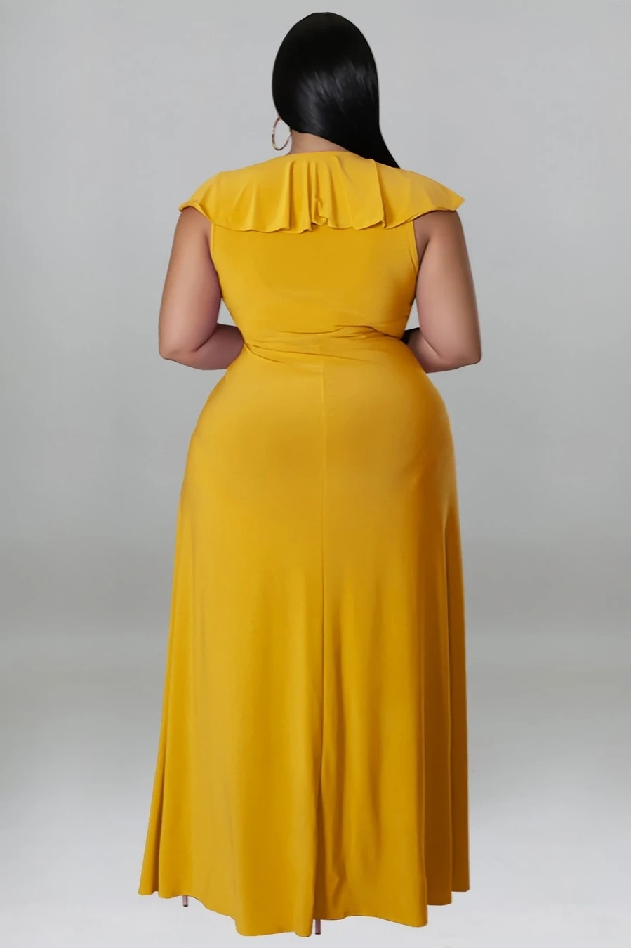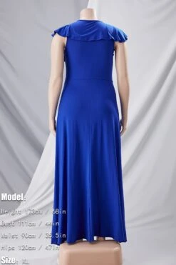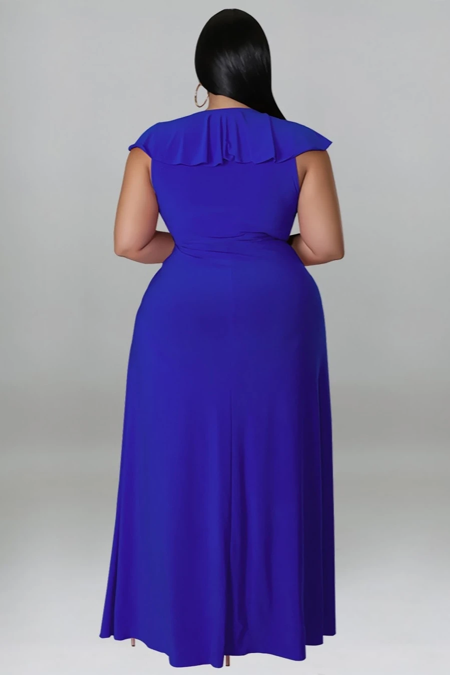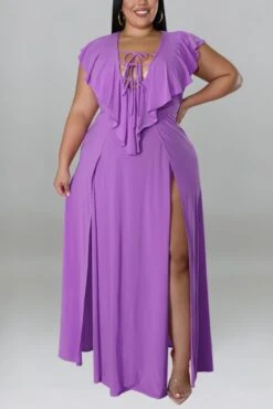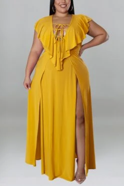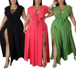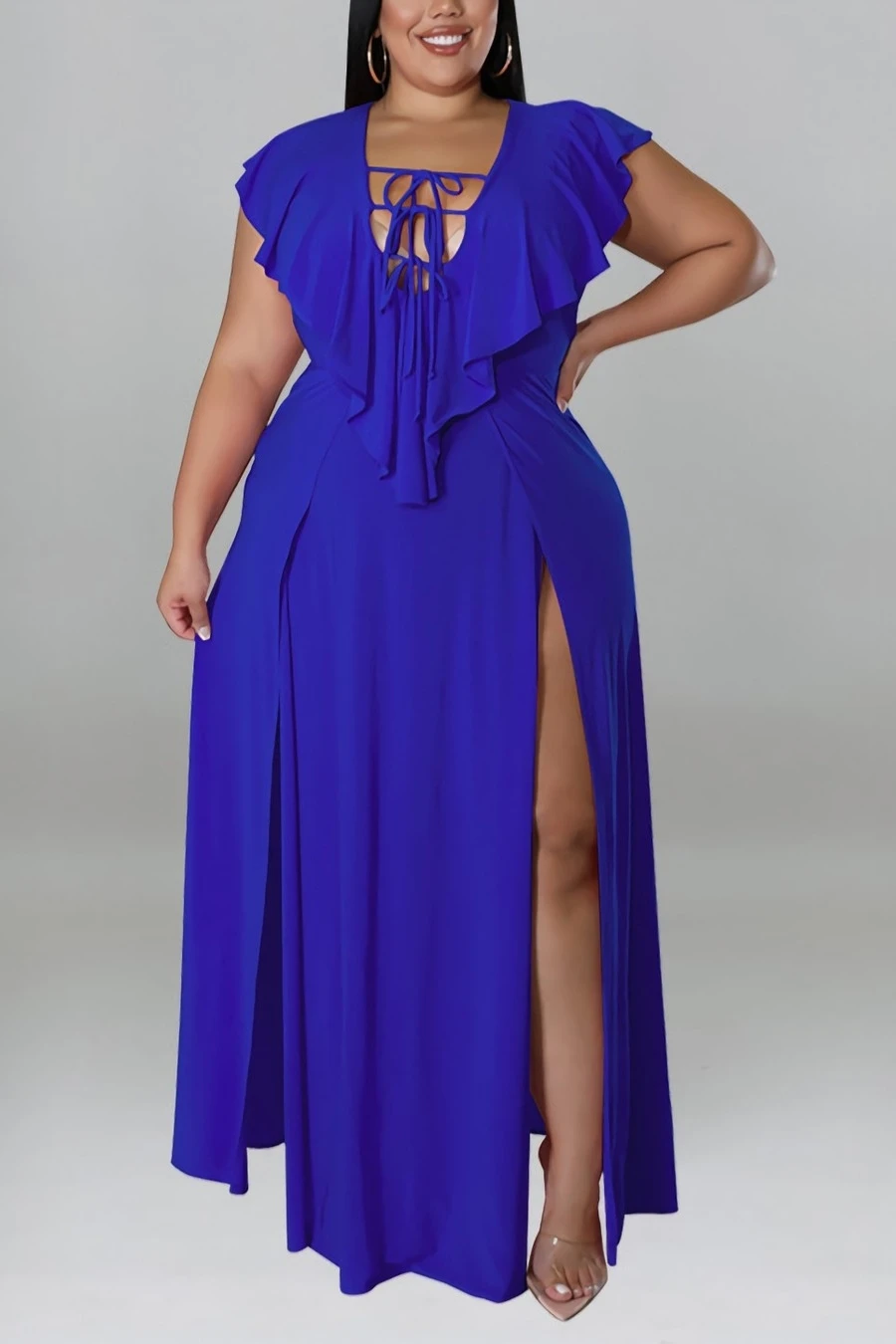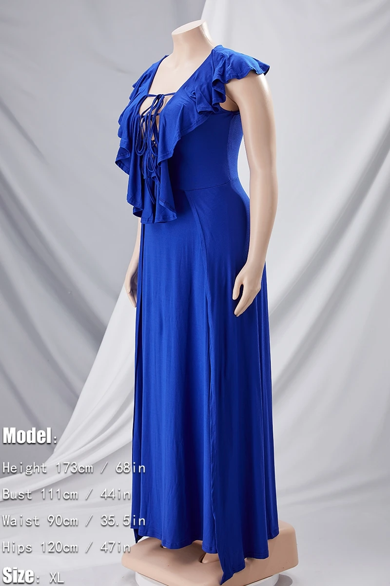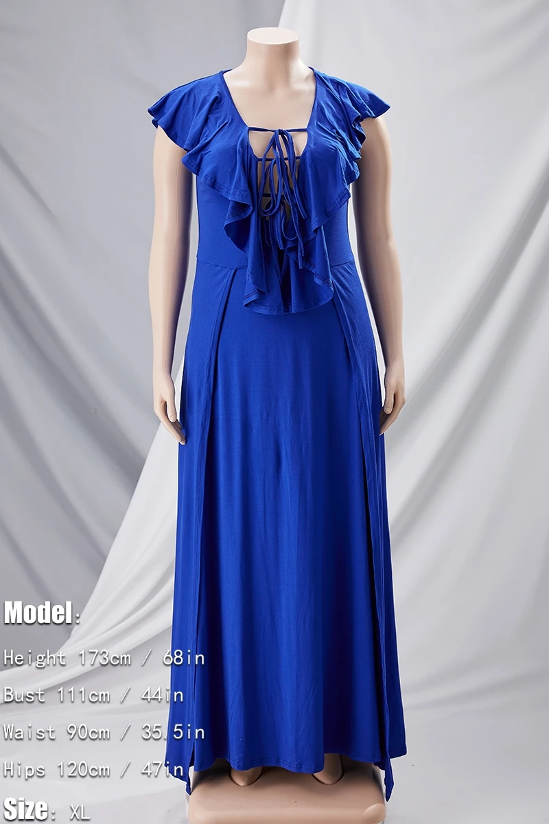 XL-5XL summer new plus size 6 colors solid color stretch v-neck lace-up ruffle high split sexy maxi dress
