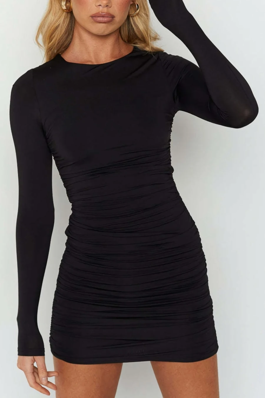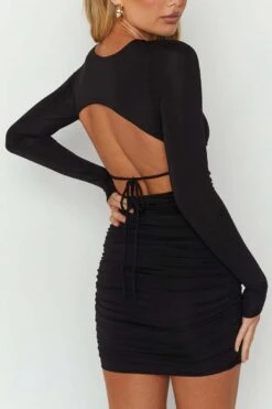 XS-L autumn new solid color slight stretch hollow lace up shirring backless stylish simple mini dress