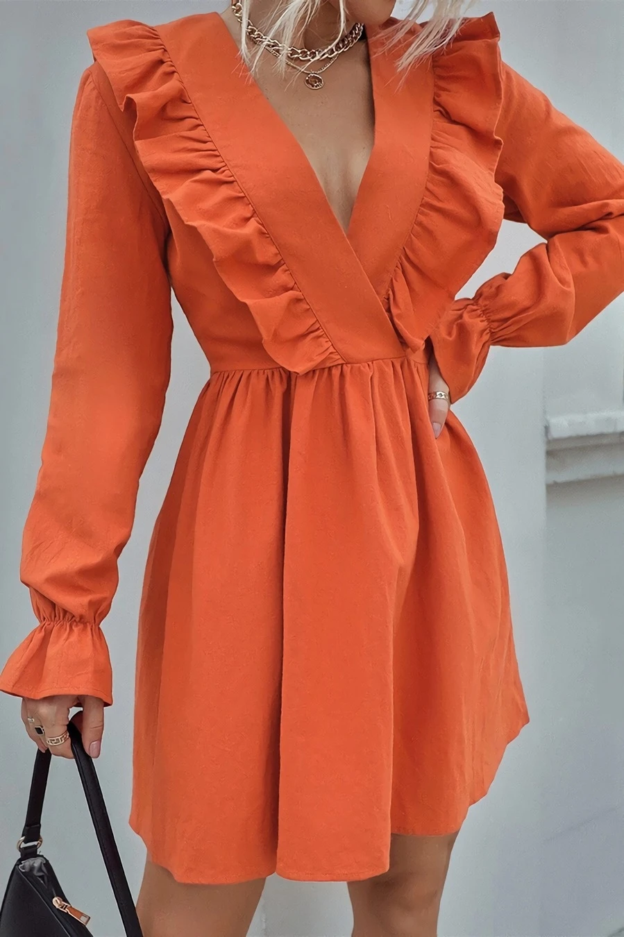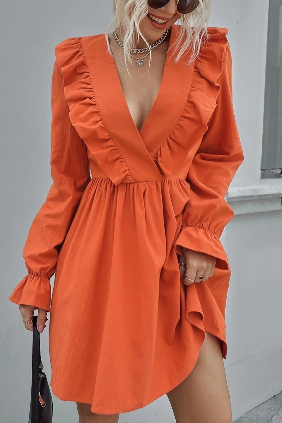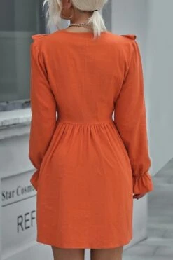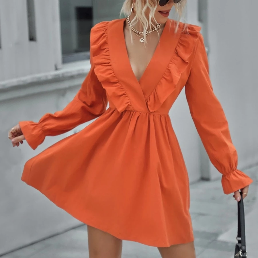 XS-L spring new stylish simple solid color orange inelastic v-neck ruffled casual mini dress