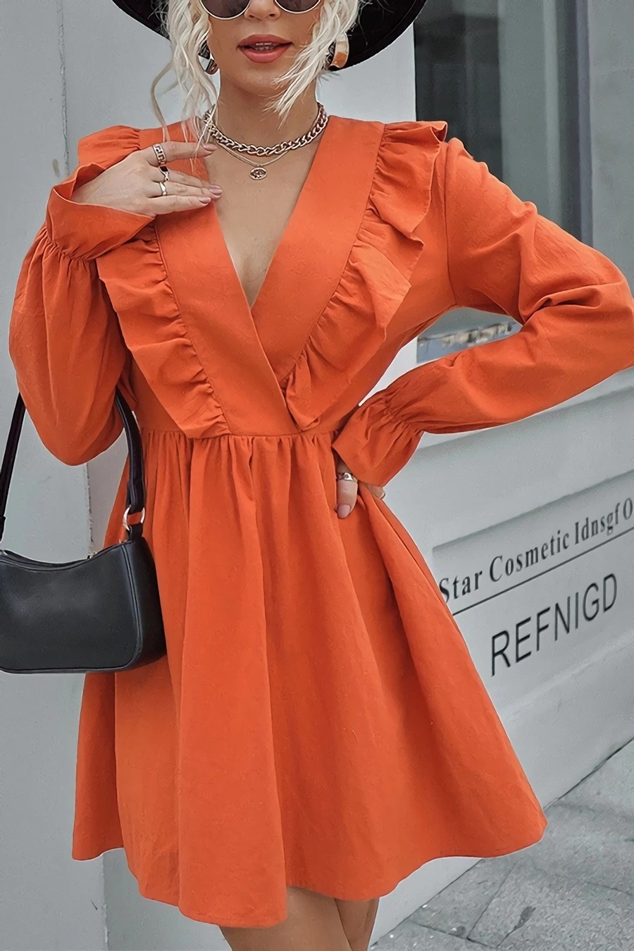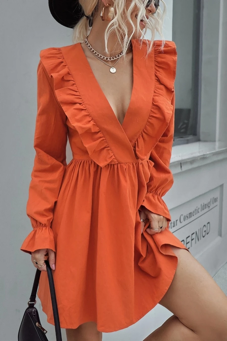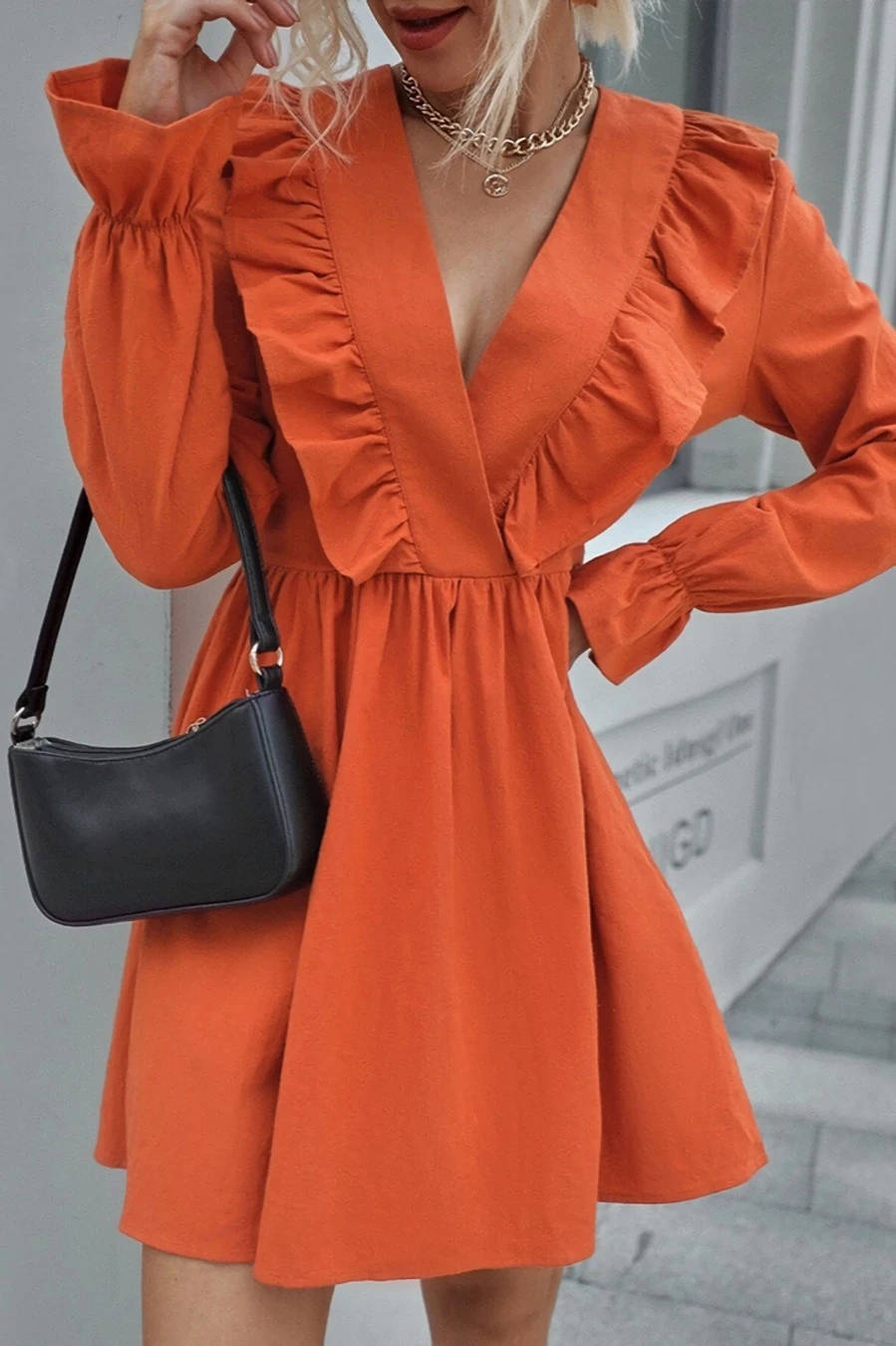 XS-L spring new stylish simple solid color orange inelastic v-neck ruffled casual mini dress