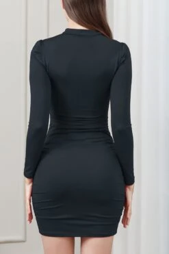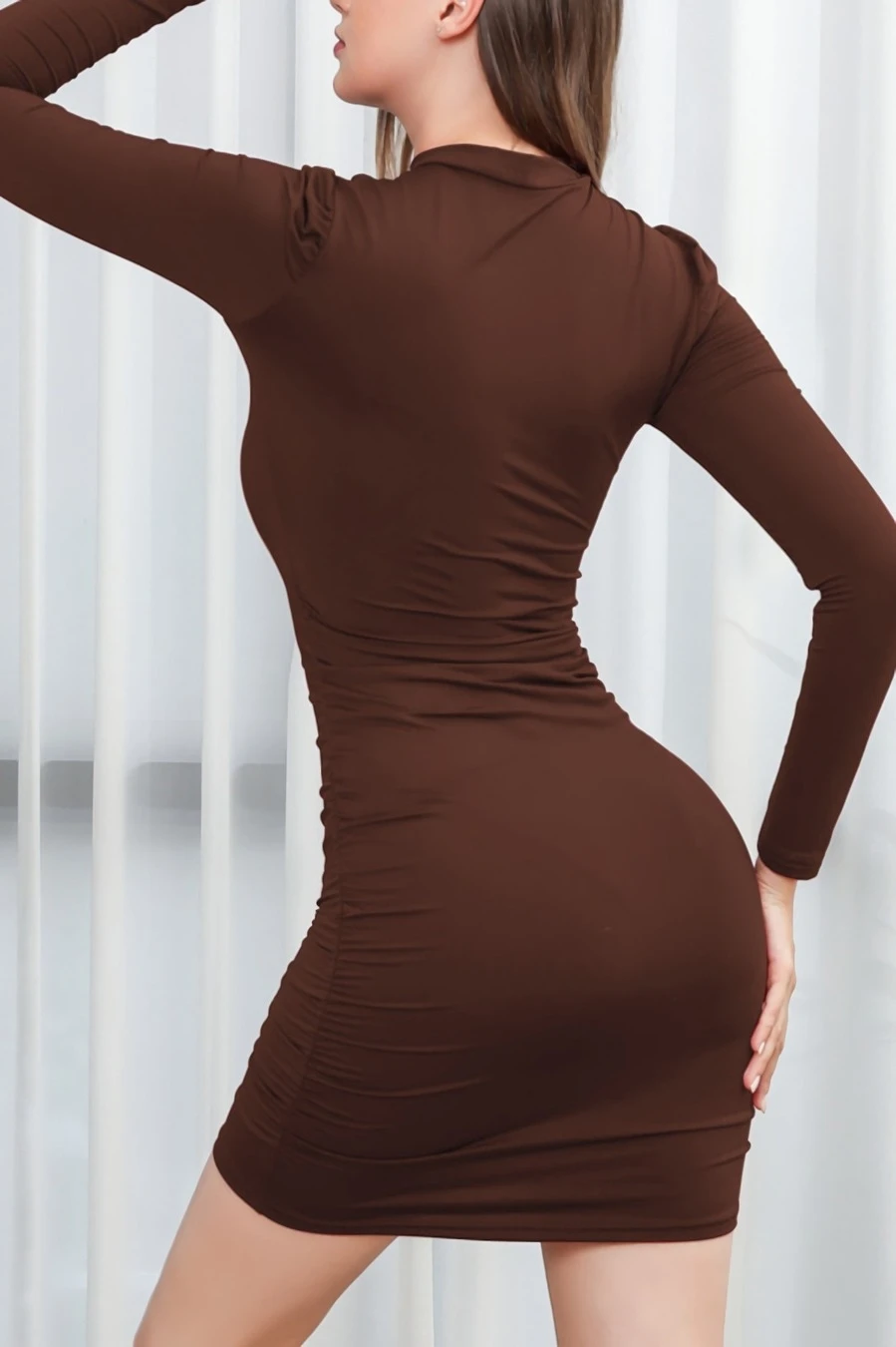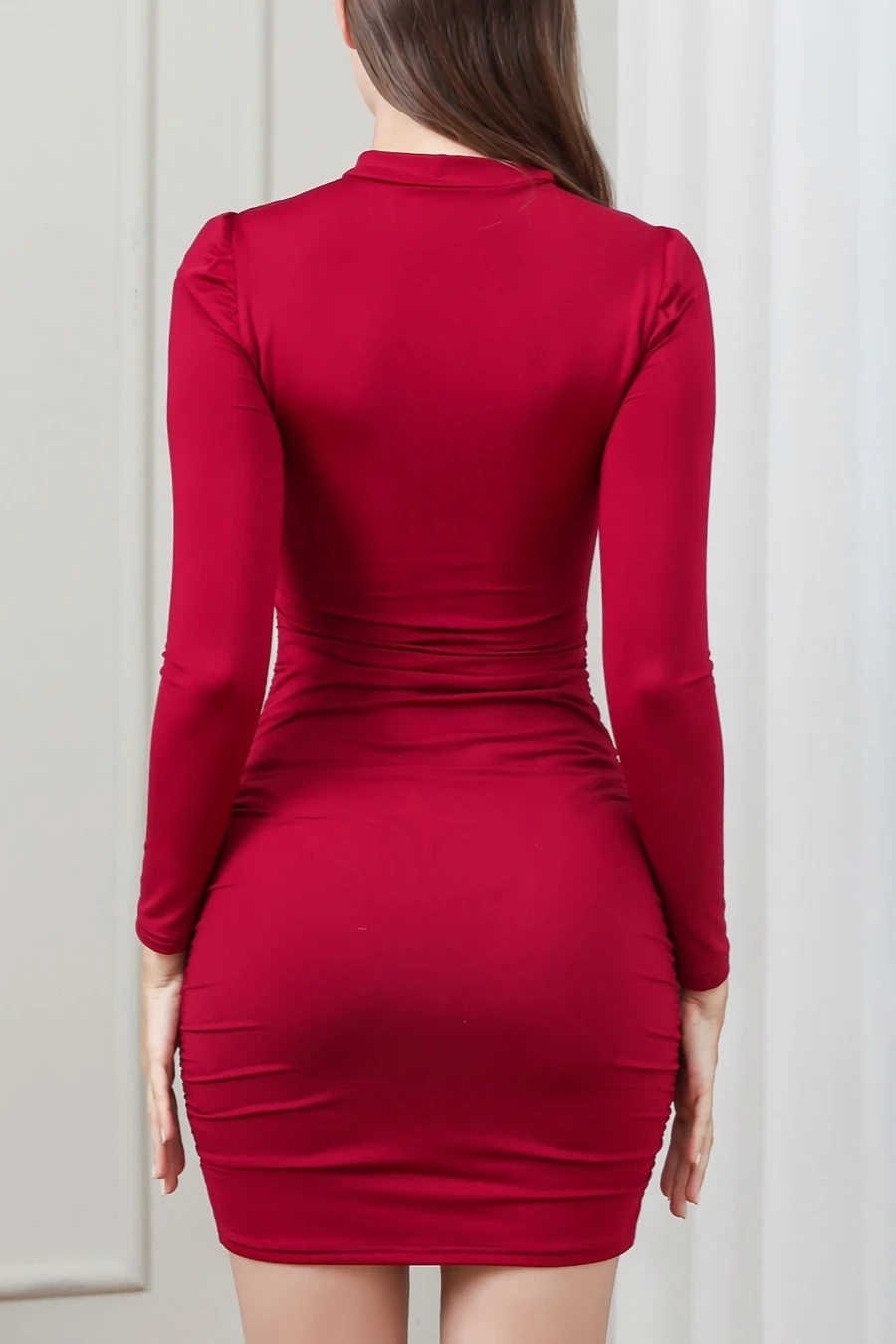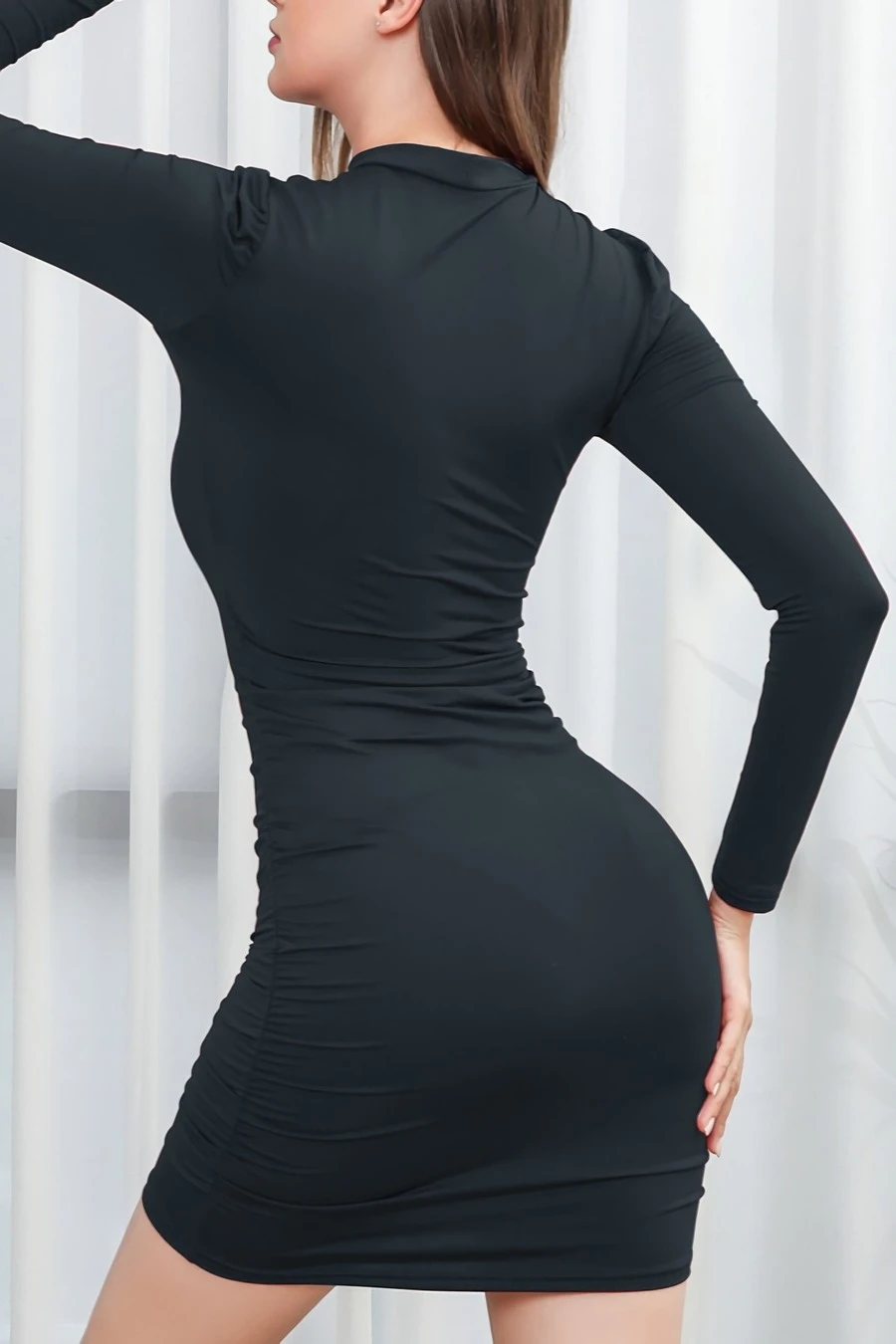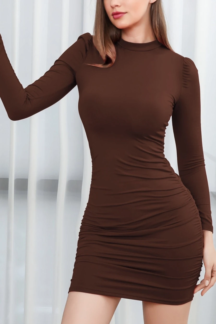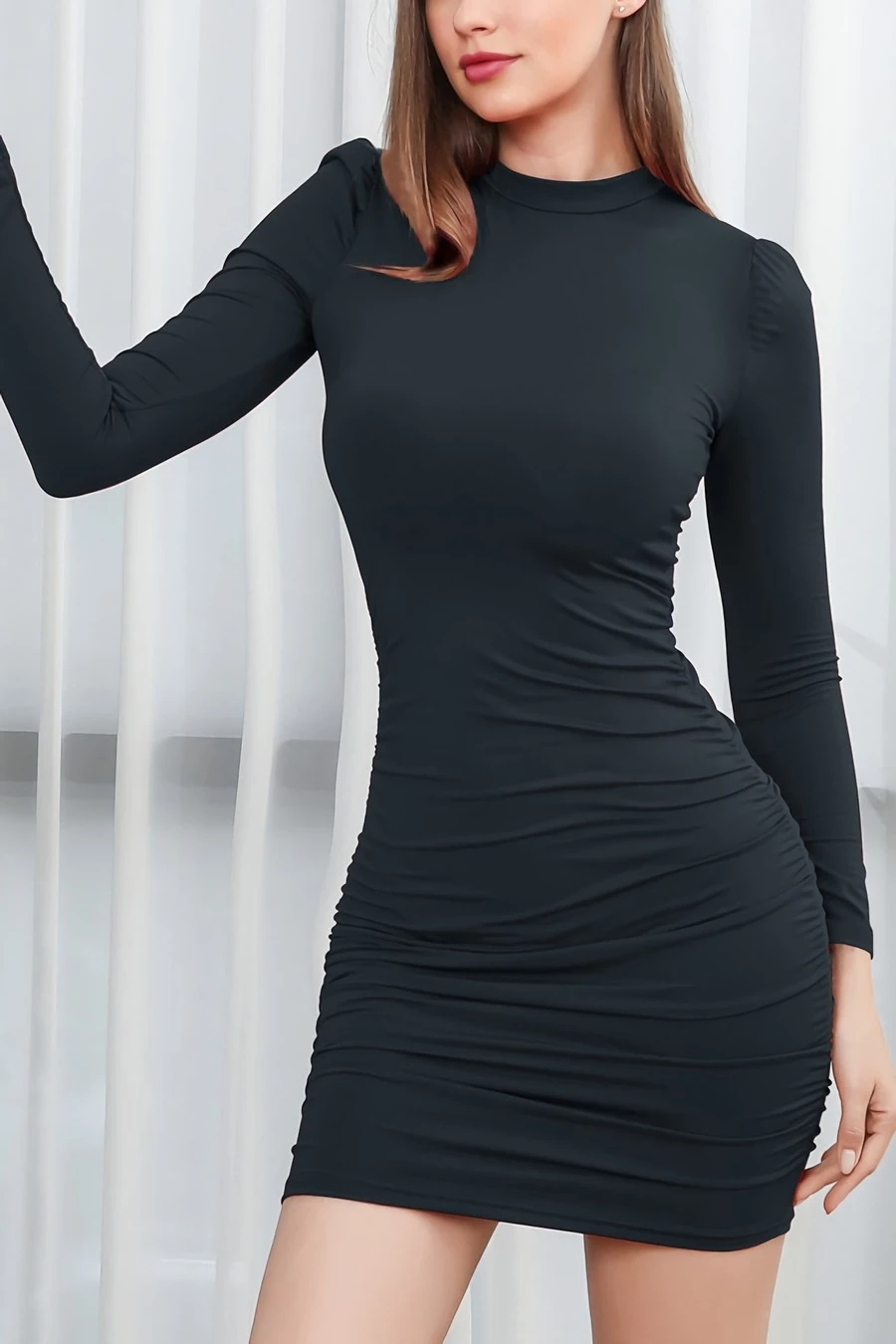 XS-L spring & summer new 3 colors long sleeve stretch crew neck shirring bodycon stylish simple mini dress