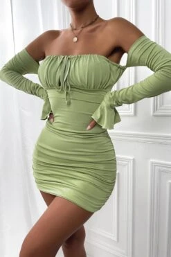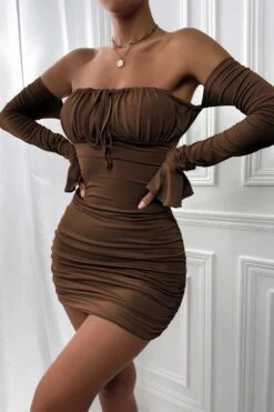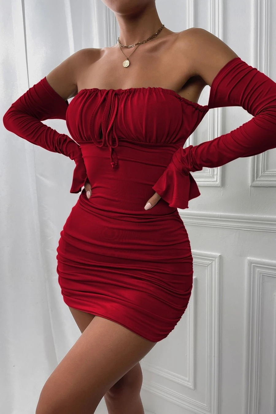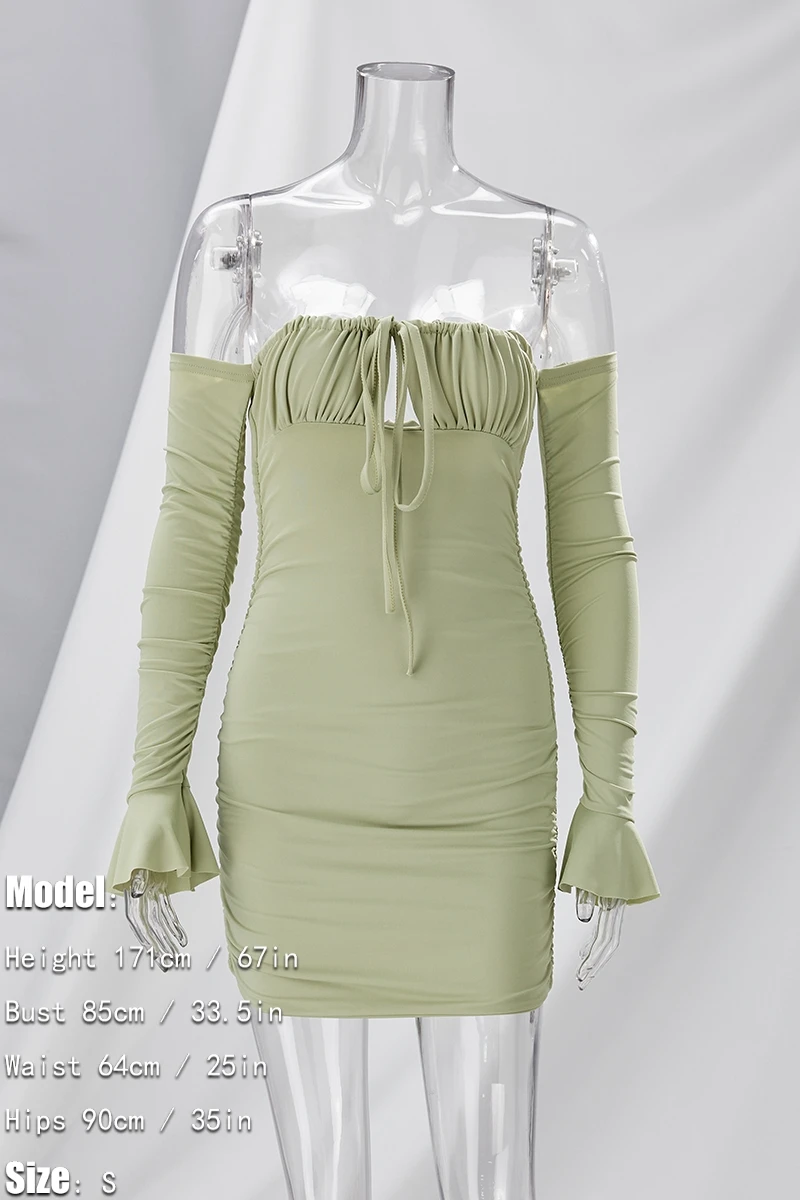 XS-L spring & summer new 5 colors solid color stretch trumpet sleeve off-the-shoulder shirring bodycon stylish sexy mini dress