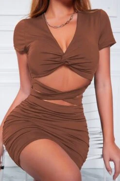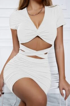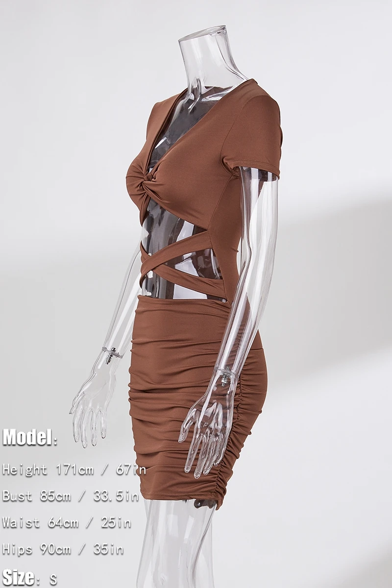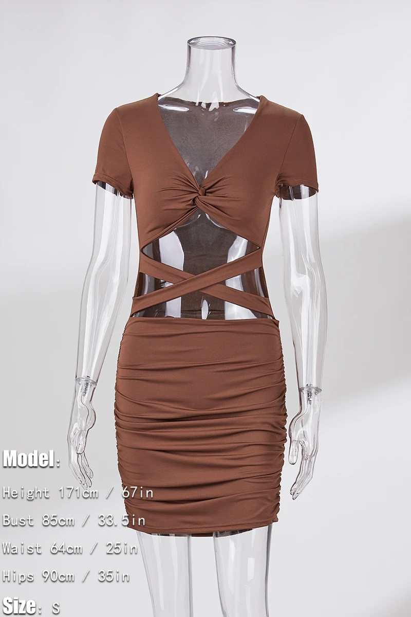XS-L summer new 3 colors slight stretch short sleeve v-neck kink design hollow shirring bodycon stylish simple mini dress