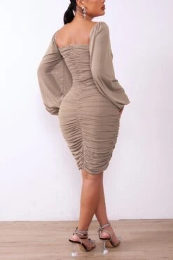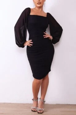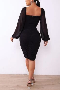 XS-XL autumn new three colors stretch square-neck lantern-sleeve backless zip-up shirring sexy bodycon midi dress