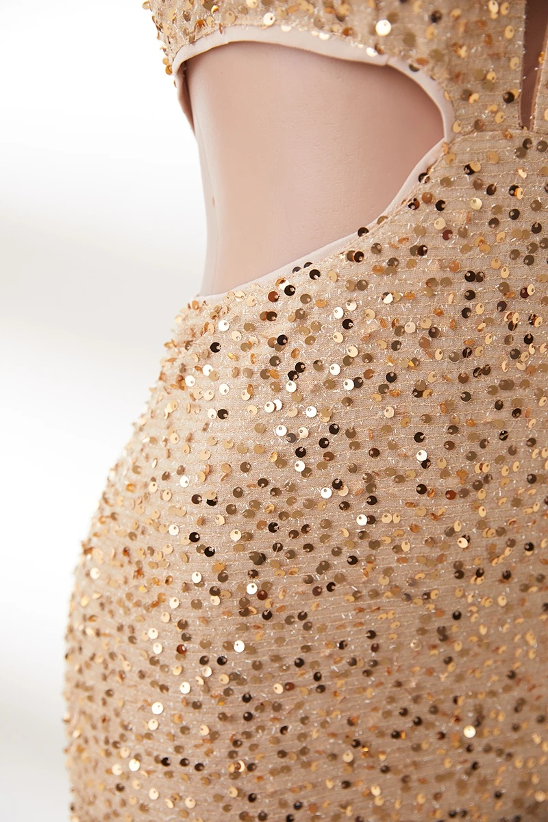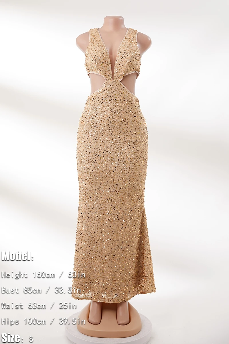 XS-XL elegant sexy slight stretch sequin mesh spliced v-neck hollow maxi dress